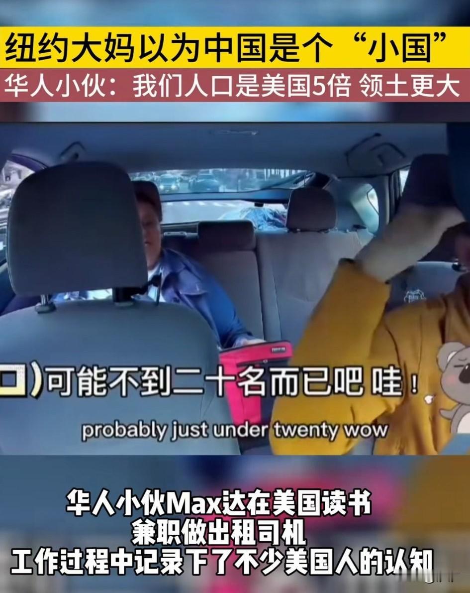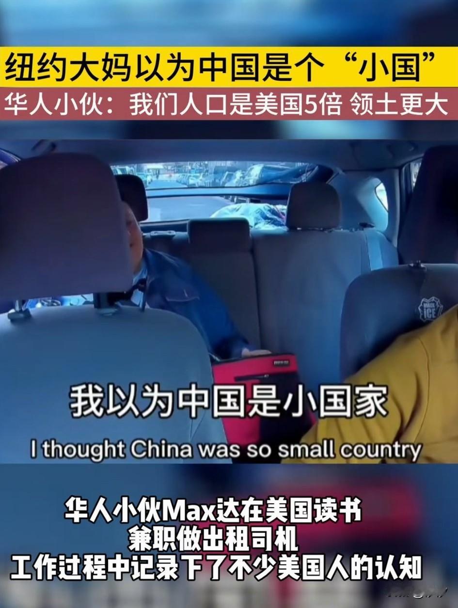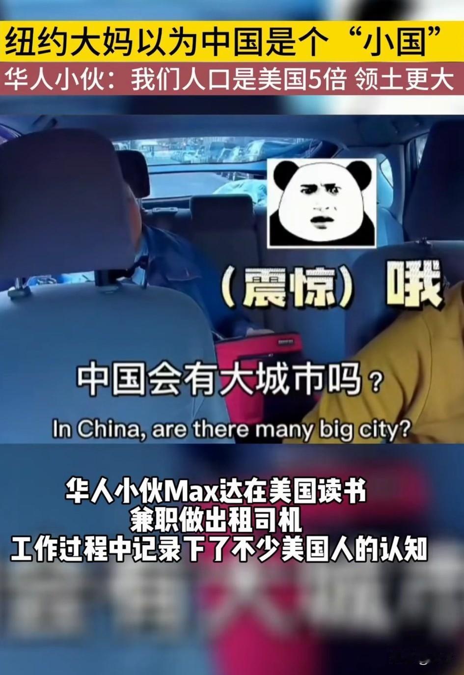 华人小伙在美国读书, 平时也兼职做出租车司机, 他用自己的镜头记录了美国人的日常, 一次偶然的机会他拉到了一位美国大妈,谈起了中国, 他妈一直以为中国是一个很小的国家, 结果华人小伙给他介绍了起来, 中国的人口是美国的五倍, 领土面积也比美国大很多, 美国大妈不可置信, 又问小伙中国有大城市吗? 华人小伙介绍纽约是美国的大城市, 但是放在中国的大城市中排不到前20, 因为中国的大城市人口非常多, 美国大妈还不服气, 又质问到中国人是不是很穷, 华人小伙解释道, 因为中国的人口非常的多, 所以说它的人均GDP会比较低, 这就是一个平均数的问题, 人均收入并不能代表中国的贫富, 毕竟中国的发展潜力非常的巨大, 看得出来很多美国人对中国并不是很了解,不知道这位大妈是不是平时不上网,有许多老外来中国旅游后详细介绍了中国的情况,大妈是一点也没有看! 大家对于美国大妈对于中国的刻板印象怎么看? 美国见闻 美国华人生活 美国打工人 老外小哥 美国当代青年 海外华裔青年