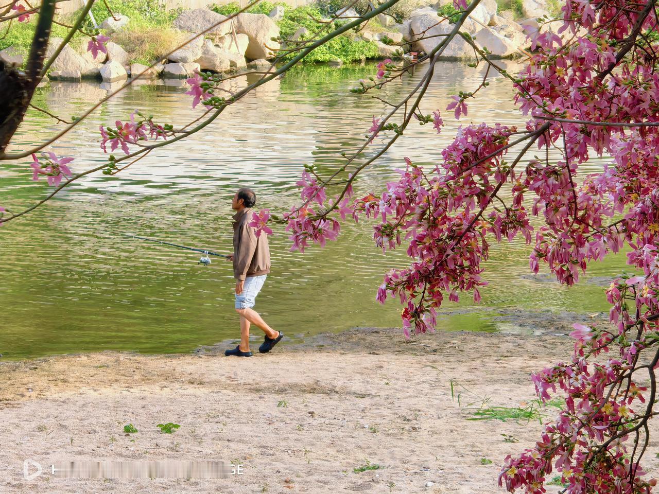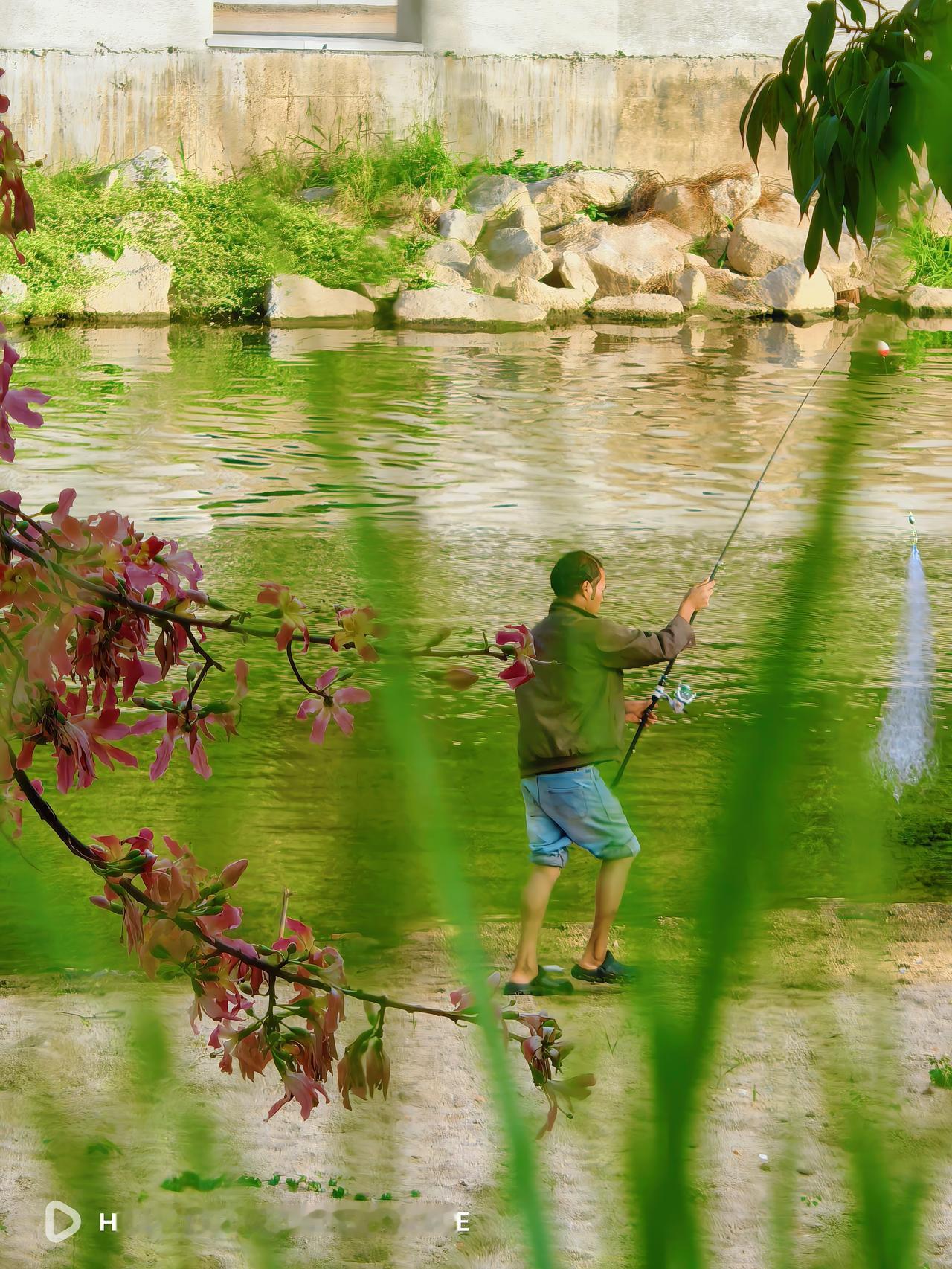 华为Pura80ultra的十倍定焦出片了,观澜河的钓鱼人,在木棉花下钓鱼的大哥