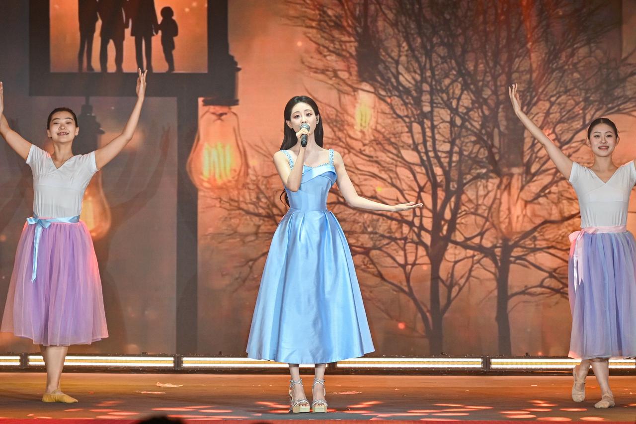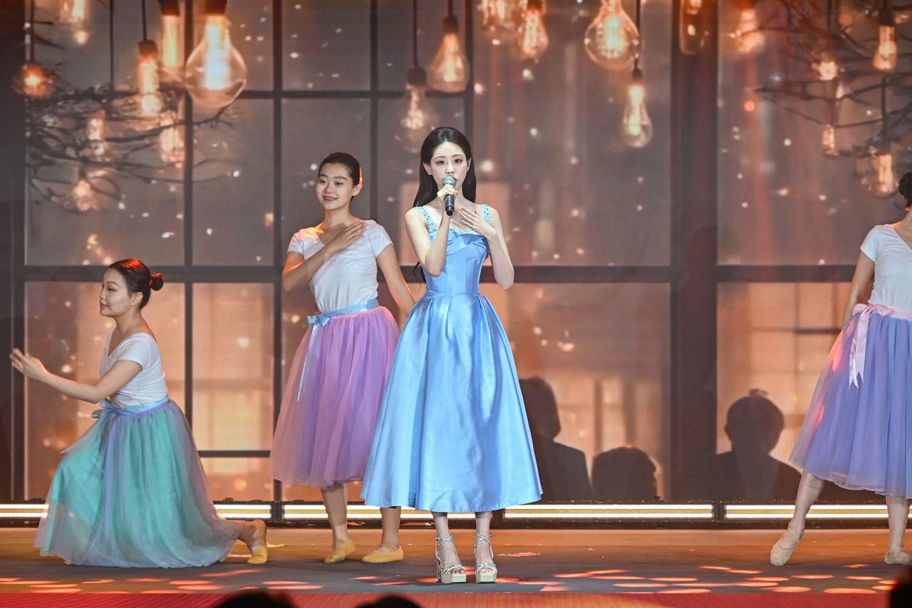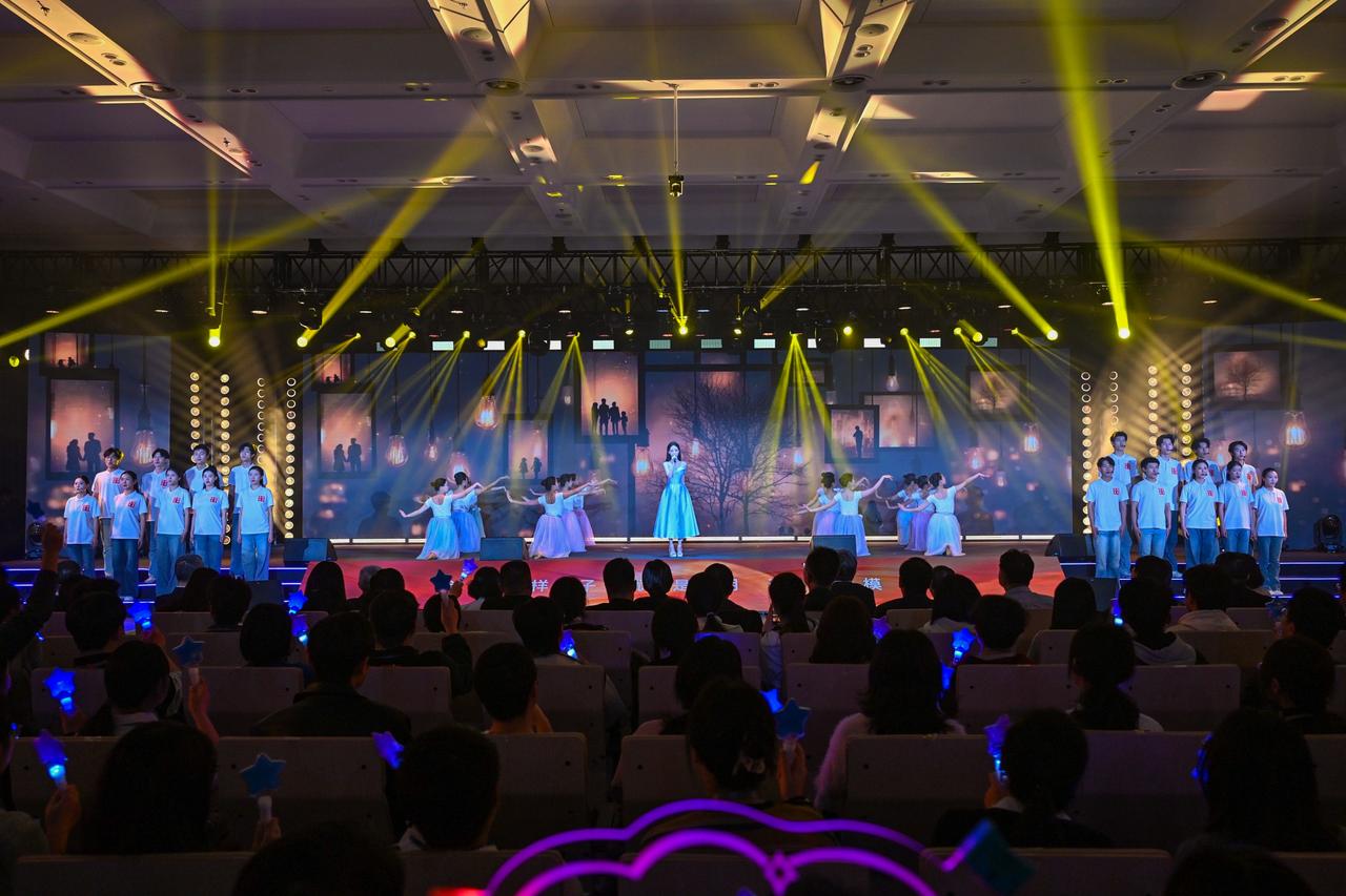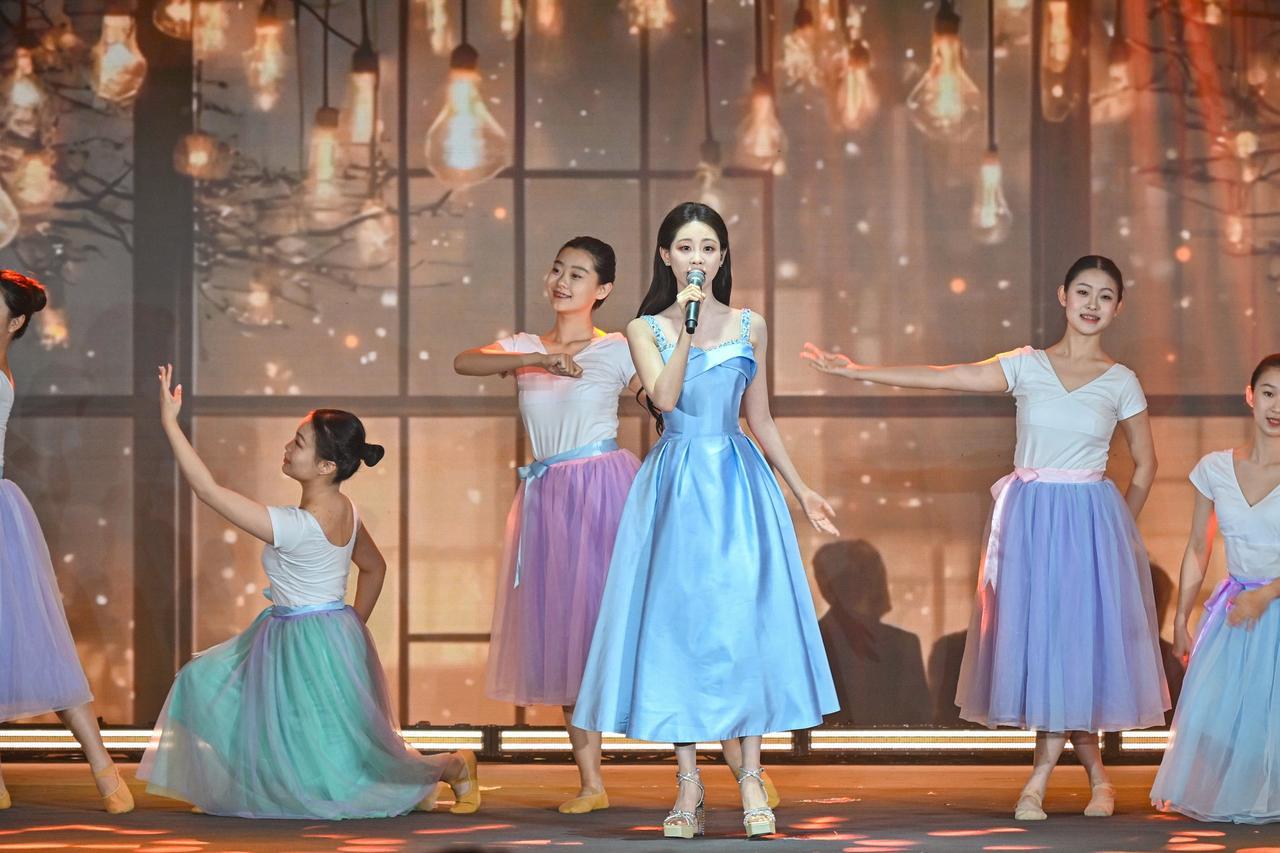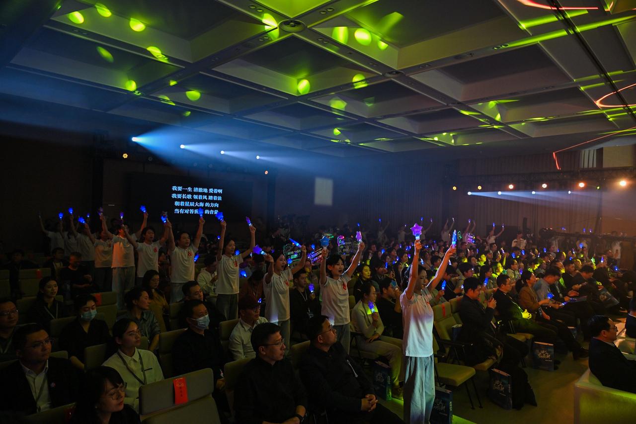 旋律激荡,青春飞扬! 在演员祝绪丹的领唱下,一曲《有我》引发全场共鸣,青年学子自发起立,挥动手中闪烁的蓝色星光。这不仅是动人的表演,更是一次青春的集体宣誓:强国有我,誓言铿锵!