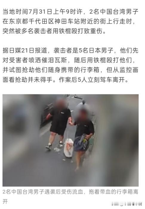 恐怖!他们的袭击目标就是中国人。他们分不清大陆和台湾人的。 今年7月,2名中国台湾人在日本东京被人用铁棍打成重伤,袭击者案发后驾车逃逸。据日本东京广播公司11月21日报道,涉案的5名袭击者已被警方逮捕,日媒在报道中公布了其中一名嫌犯的名字及画面。 说白了,日本人喊着 “保护台湾” 的鬼话,骨子里要的从来不是台湾人,而是台湾这块土地,连自己要 “保护” 的对象都能认错毒打,这哪是保护分明是屠杀前兆! 今年 7 月东京街头那场血腥袭击至今想起来都让人后背发凉,两名中国台湾同胞好端端地出门,没招谁没惹谁,就被 5 名日本暴徒拿着铁棍往死里打,最后落得重伤的下场,施暴者打完人就开车溜之大吉,完全没把人命当回事。 直到 11 月 21 日,东京广播公司才报道说这 5 名嫌犯终于被逮捕,还公布了其中一人的信息,但这迟来的逮捕根本抹不掉受害者身上的伤,更遮不住事件背后的恐怖真相。 很多人可能会疑惑,日本不是一直对着台湾喊 “友好” 吗?不是动不动就说要 “保护台湾” 吗?怎么转头就把台湾同胞打成重伤? 其实答案再简单不过,这些袭击者的目标根本就是中国人,他们眼里根本分不清大陆人和台湾人,在他们看来,只要是华人面孔,就活该成为攻击对象。 而更讽刺的是,日本口中的 “保护台湾”,从一开始就和 “台湾人” 没半毛钱关系。 他们馋的是台湾的地理位置,是那里的资源,是能把台湾当成遏制中国的棋子,至于生活在那块土地上的人,在他们眼里不过是可以随意摆弄、甚至可以牺牲的附属品。 想想看,要是真把台湾人当回事,怎么会出现 “认错人就往死里打” 的闹剧?这哪里是友好,分明是骨子里的轻蔑和敌意。 那些暴徒之所以敢光天化日之下动粗,恐怕也是吃准了日本社会对华人的这种隐性歧视,觉得就算打错了,也没人会真的深究。 而更让人细思极恐的是,这起事件绝不是孤立的偶然,近年来在日本,针对华人的骚扰、袭击事件其实屡有发生,只是很多时候没有被大规模报道而已。 这背后折射出的,是日本社会中一部分人对中国的敌意正在逐渐发酵,而 “台湾” 不过是他们用来挑事的借口。 那些执迷不悟的台独分子,还整天幻想着靠日本撑腰,觉得抱住了日本的大腿就能 “谋独” 成功,真是天真得可笑,他们没看清的是,日本从来不是什么救世主,而是想吃掉台湾的饿狼。 今天他们能因为 “认错人” 就殴打台湾同胞,明天要是真的让他们得偿所愿,把台湾攥在手里,台湾人只会迎来更悲惨的结局。 毕竟,对于日本来说,有用的是台湾这块地,而不是台湾人,当台湾人失去利用价值,或者敢反抗他们的控制时,等待台湾人的只会是更残酷的对待,所谓的 “保护” 不过是包裹着毒药的糖衣。 这起袭击事件就像一面镜子,照出了日本的虚伪,也照出了台独分子的愚蠢,日本喊着 “保护台湾” 的口号,干的却是伤害台湾人的勾当;台独分子抱着幻想投靠日本,最终只会把台湾人推向深渊。 两名台湾同胞的重伤,是无辜者的悲剧,但也给所有清醒的人敲响了警钟:任何企图分裂自己国家的人,最终只会被外人利用,成为历史的笑柄;而任何打着 “友好” 旗号觊觎中国领土的国家,也迟早会为自己的野心付出代价。 当然,以上只是我个人的看法,大家对这起事件还有什么不同的解读,或者想分享更多想法,都可以在评论区留言交流。