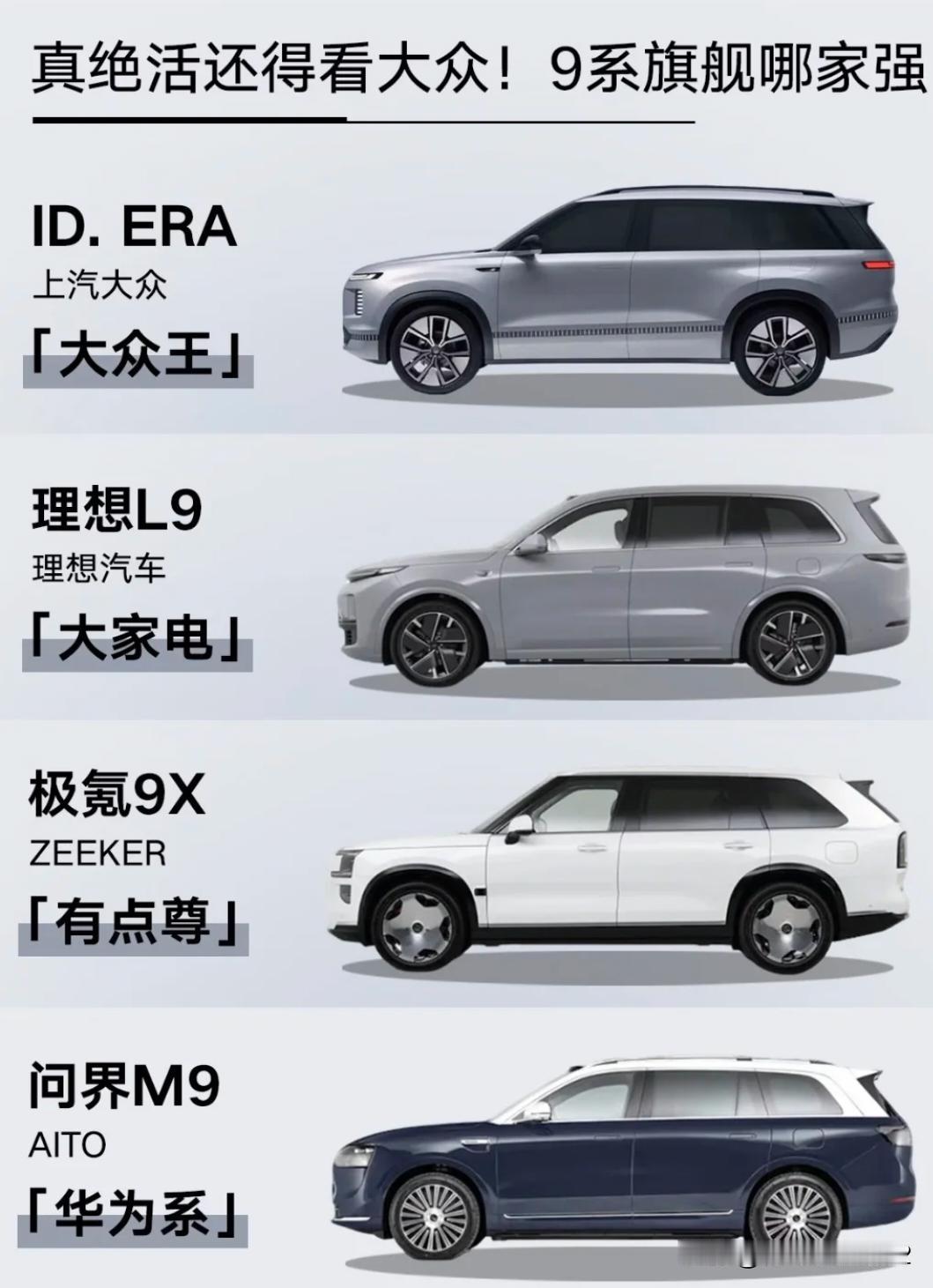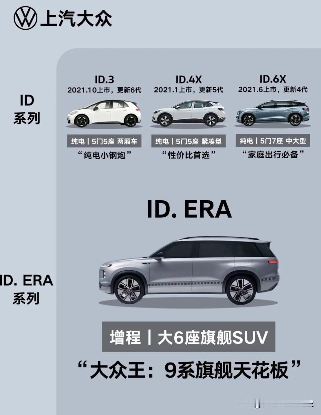 看见大6座SUV的电车在中国卖这么好,大众也按耐不住了,ID上新 跟上节奏, 明年Q1上新ID增程式大六座SUV: 1. 动力续航: -搭载EA211 1.5T EVO II增程器 -CLTC纯电续航超350km,综合续航破1000km;也算给了一个大电池了。 -支持800V高压快充,10分钟可补能300km。充电便捷性大大提高。 -支持外放电功能,不知道多大的功率,不过至少应该3kW,接个电磁炉,来个小火锅应该是没有问题。 2. 尺寸与座椅: -车身尺寸约5200×2000×1800mm,现在没有5米2,都不好意思说是大6座。 -轴距3100mm采用2+2+2六座布局 -第二排是独立航空级行政座椅 -第二排吸顶娱乐屏。也算已经有了冰箱和沙发,还有彩电了。 3. 智能与座舱: -配Momenta无图L3级智驾系统, -支持高速、城区点到点导航辅助。 4. 底盘操控: -标配双叉臂前悬+五连杆后悬 -双腔空气悬架与AI CDC自适应减震系统 -搭配主动后轮转向系统。 最后我估计以大众的调性,应该30万起价。 大众id 上汽大众id 大众纯电id7 上汽大众id7 大众id4c 上汽大众SUV 大众id4x