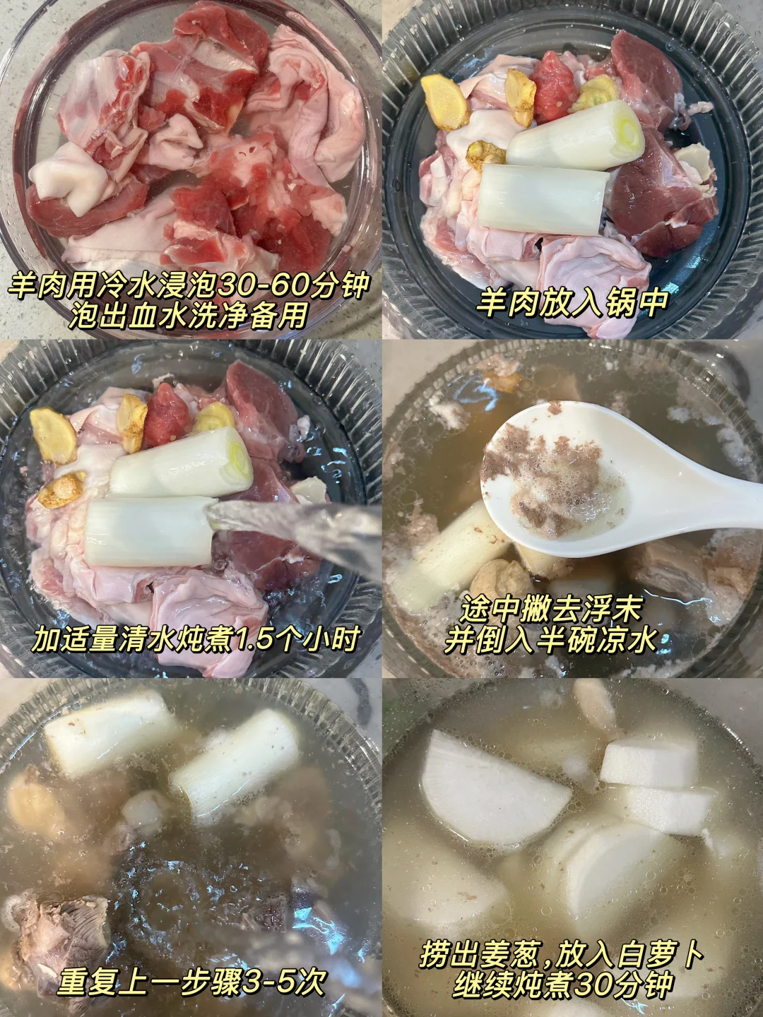 2️⃣ 炖清汤:羊肉冷水下锅,加葱姜。水开后撇去浮沫,然后倒入半碗凉水,再次煮开再撇沫。重复3-5次,汤色会变得清澈。