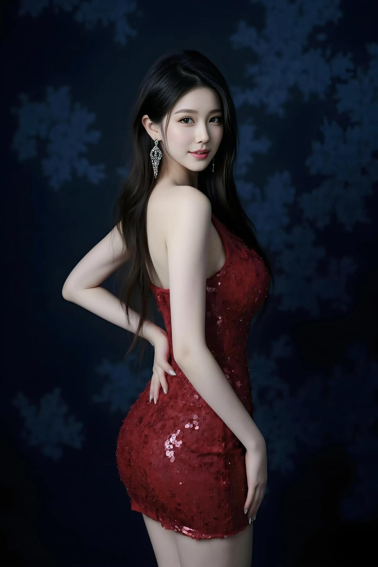 深红亮片吊带裙随动作勾勒出曼妙曲线,细肩带下锁骨在暗光中轻跃,耳畔长坠与碎钻在深蓝树影里摇曳生辉。好身材性感女神