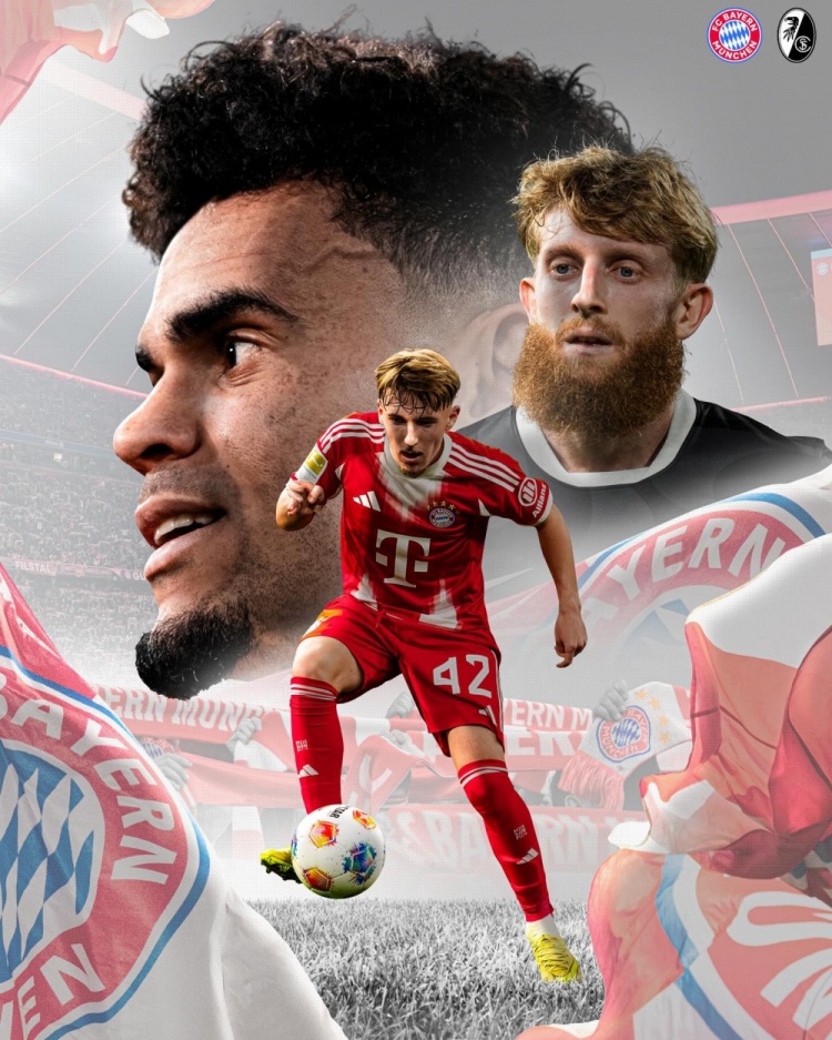 拜仁官方社媒发布了为此役制作的海报,拜仁方面迪亚斯、伦纳特·卡尔出镜,弗赖堡方面则是贝斯特出镜。