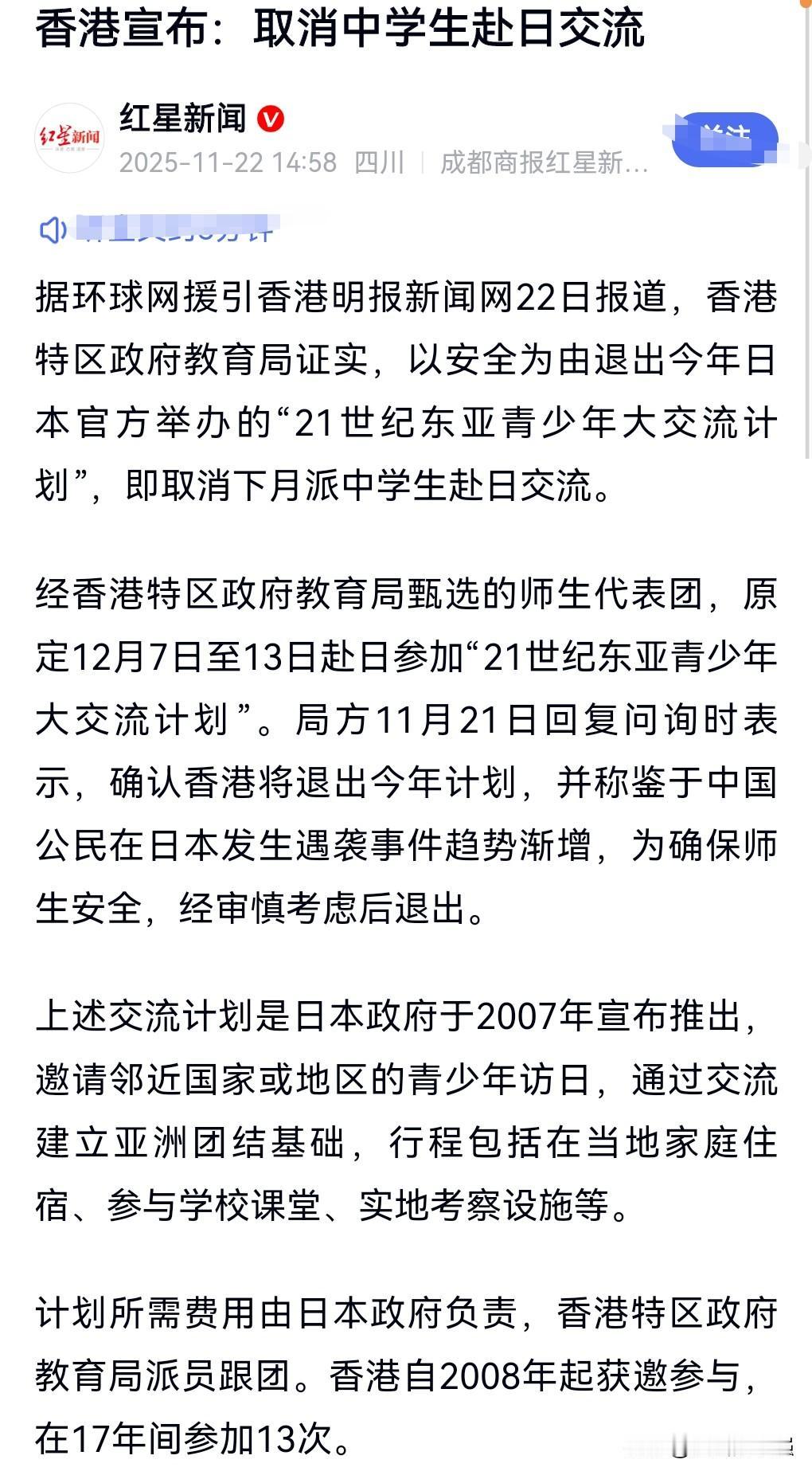 在民族大义面前,香港做出了正确的选择。 高市早苗涉台不当言论引发广泛批评。 11月22日消息,香港宣布:取消中学生赴日交流。 取消就对了,毕竟高市早苗这人太不行了。 要让她吃吃苦头了。 看她嘴硬到什么时候。 一个女人竟然这么强硬,这么邪恶。