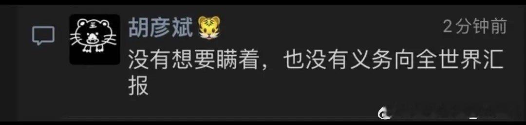 胡彦斌深夜空降回应;谢谢你们一直维护我,替我说话,知道你们承受了很多,我万分抱歉!表示:“没有想要瞒着,也没有义务向全世界汇报!