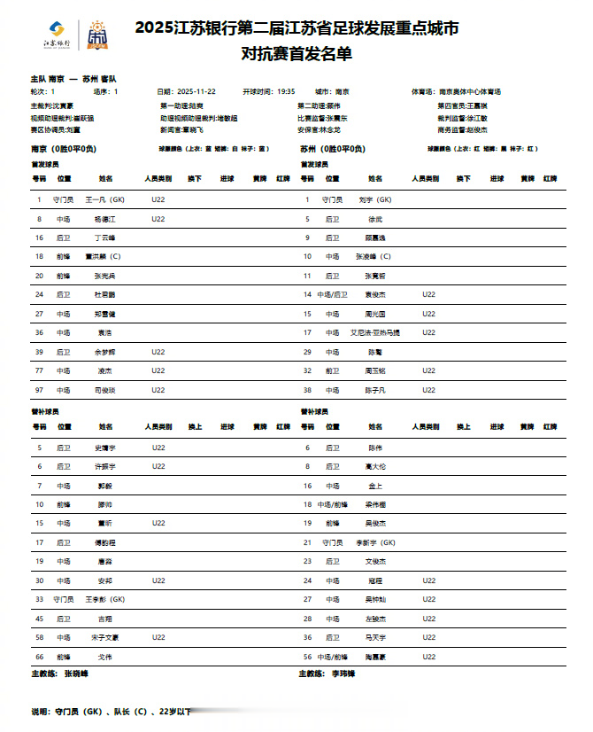 虎扑11月22日讯今晚19:35,第二届江苏省足球发展重点城市对抗赛即将开始,赛前双方公布首发名单。