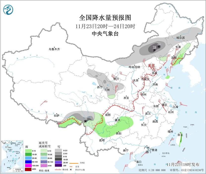 11月23日20时至24日20时,内蒙古中东部、东北地区中南部、甘肃中东部、宁夏、青海东北部、川西高原南部、云南西北部、西藏东部等地部分地区有小雪或雨夹雪,其中,内蒙古东部、西藏东部、四川西部等地部分地区有中到大雪,局地暴雪(10~12毫米);东北地区东南部、四川盆地南部、重庆东南部、贵州北部、云南东北部等地部分地区有小雨。内蒙古中西部、青海北部和东部、西北地区东北部、华北等地部分地区有5~7级大风,阵风8~9级,黄淮北部和西部、江汉等地部分地区有5~6级大风,局部地区阵风7~8级(见图4)。