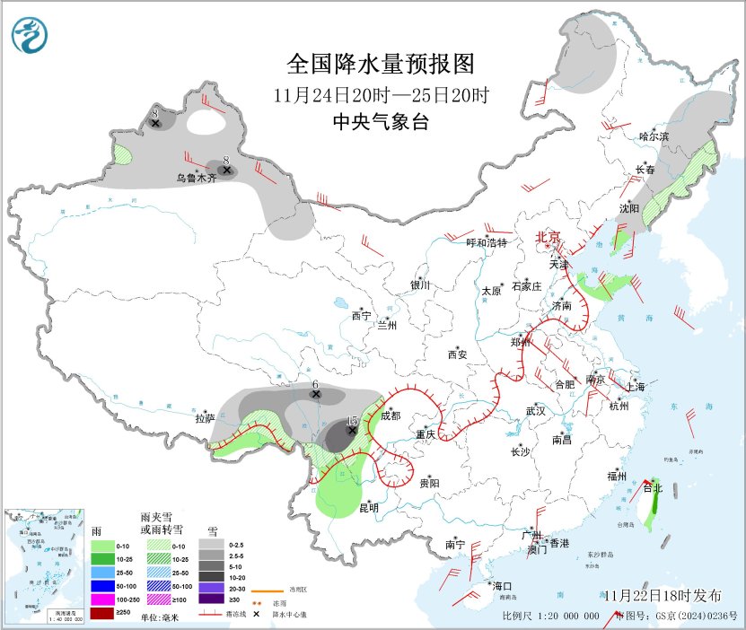 11月24日20时至25日20时,新疆北部、内蒙古东北部、东北地区东部、西藏东部、川西高原、云南西北部等地部分地区有小雪或雨夹雪,其中,新疆北疆西部和沿天山东部地区、西藏东部、川西高原南部、云南西北部等地部分地区有中到大雪,局地暴雪(10~15毫米);西藏东南部、辽东半岛、山东半岛、四川盆地西南部、云南北部等地部分地区有小雨。新疆北部、内蒙古中西部、西北地区东北部等地部分地区有5~6级风,局地阵风7~8级;南海中东部有7~8级大风、阵风9级,渤海海峡、黄海大部、东海、台湾海峡、北部湾、琼州海峡、南海等部分海域有5~7级大风、阵风7~8级(见图5)。