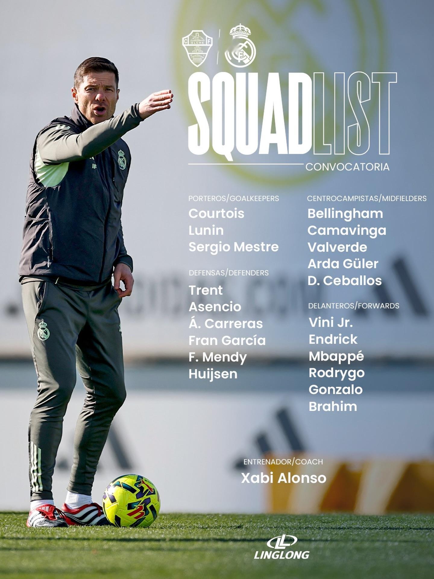 虎扑11月22日讯西甲第13轮,皇家马德里客场对阵埃尔切。赛前皇马官方公布本场比赛大名单。