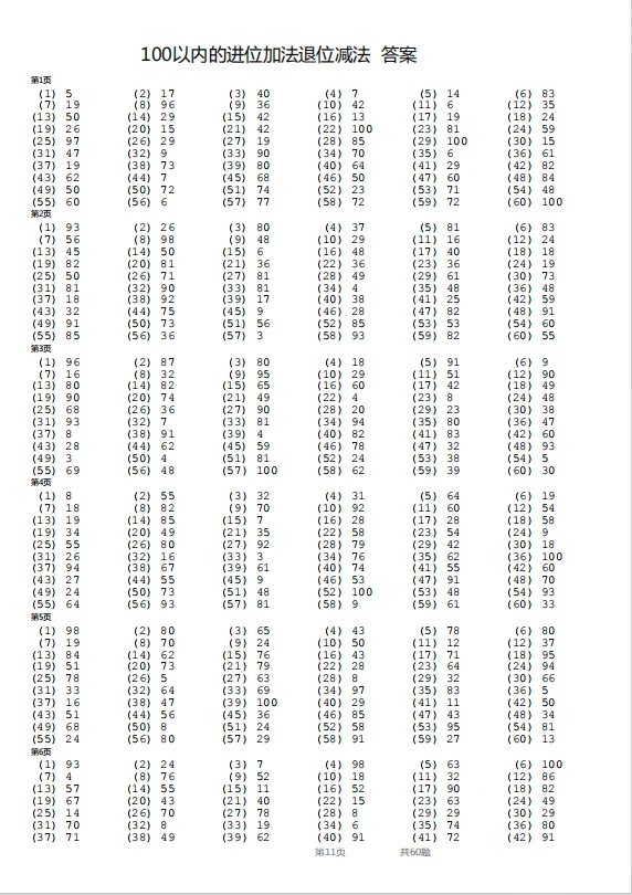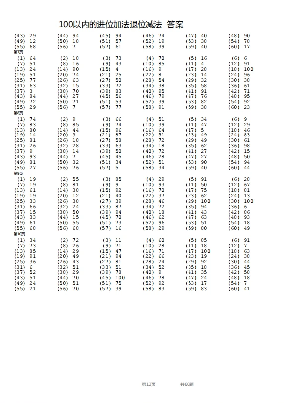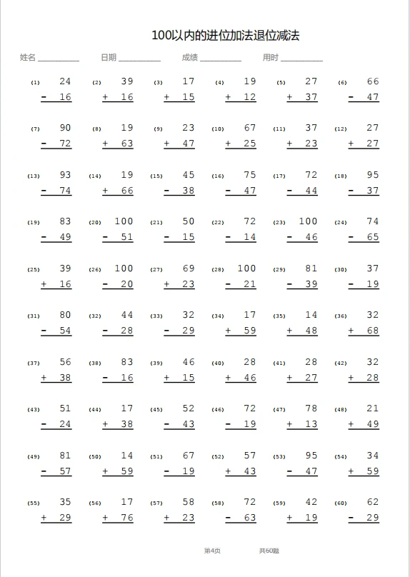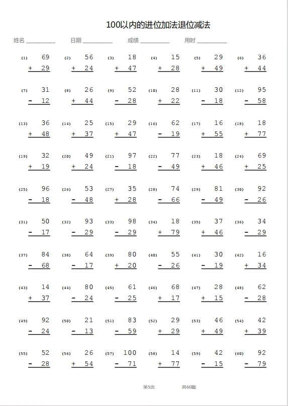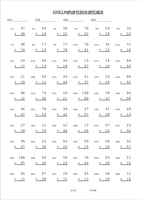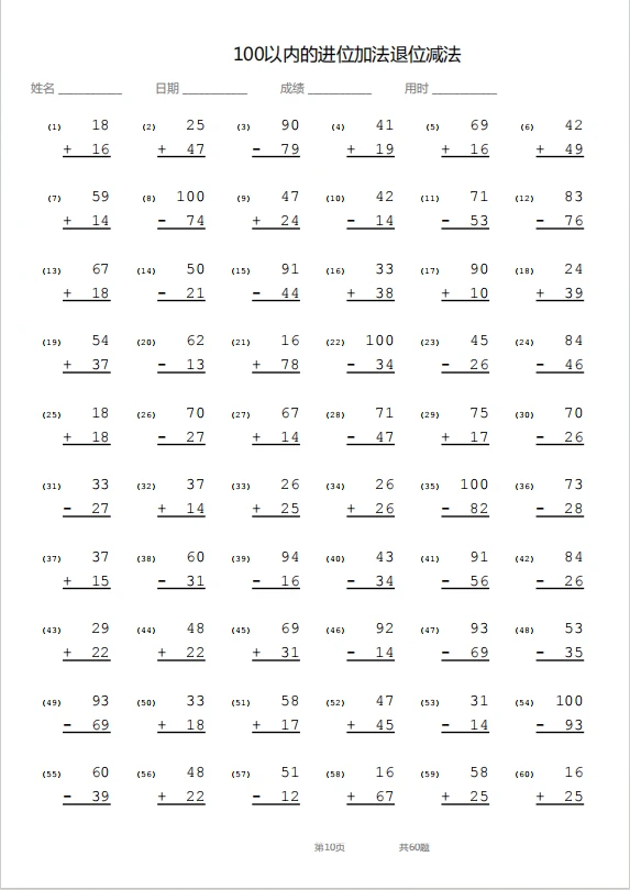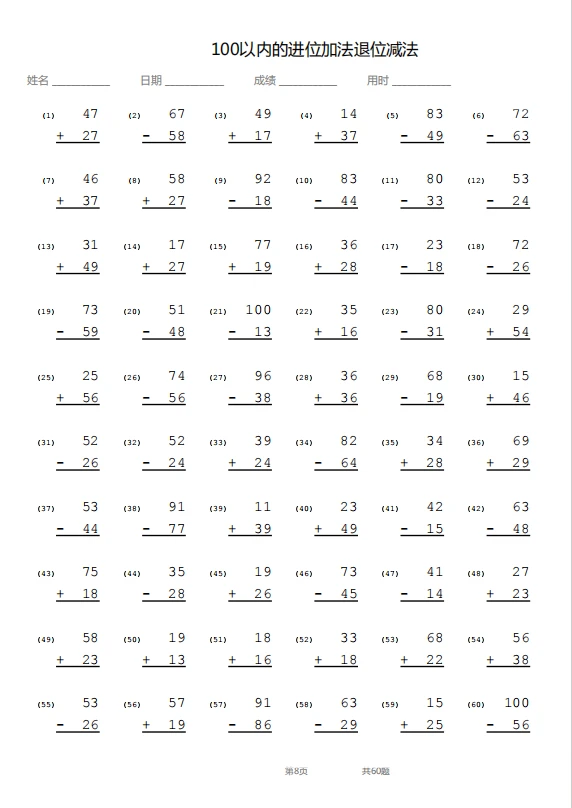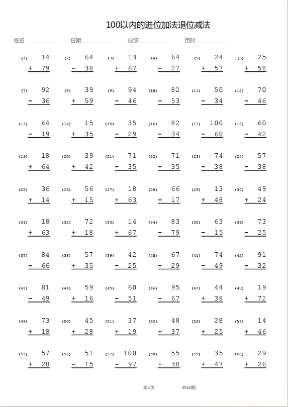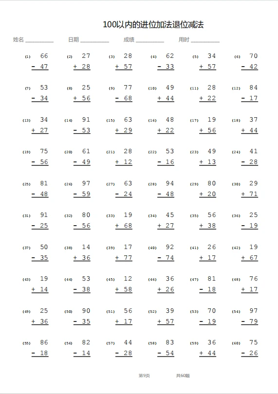 竖式—100以内退位加进位减法