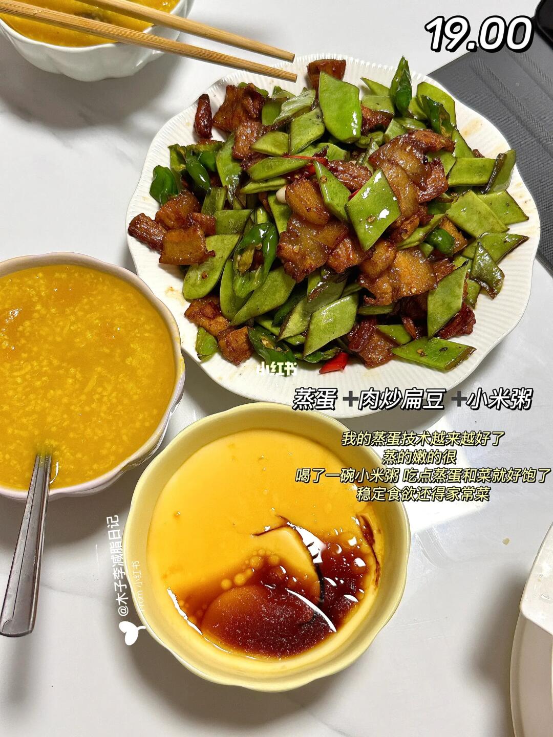 🥣晚:蒸蛋 小米粥 肉炒扁豆