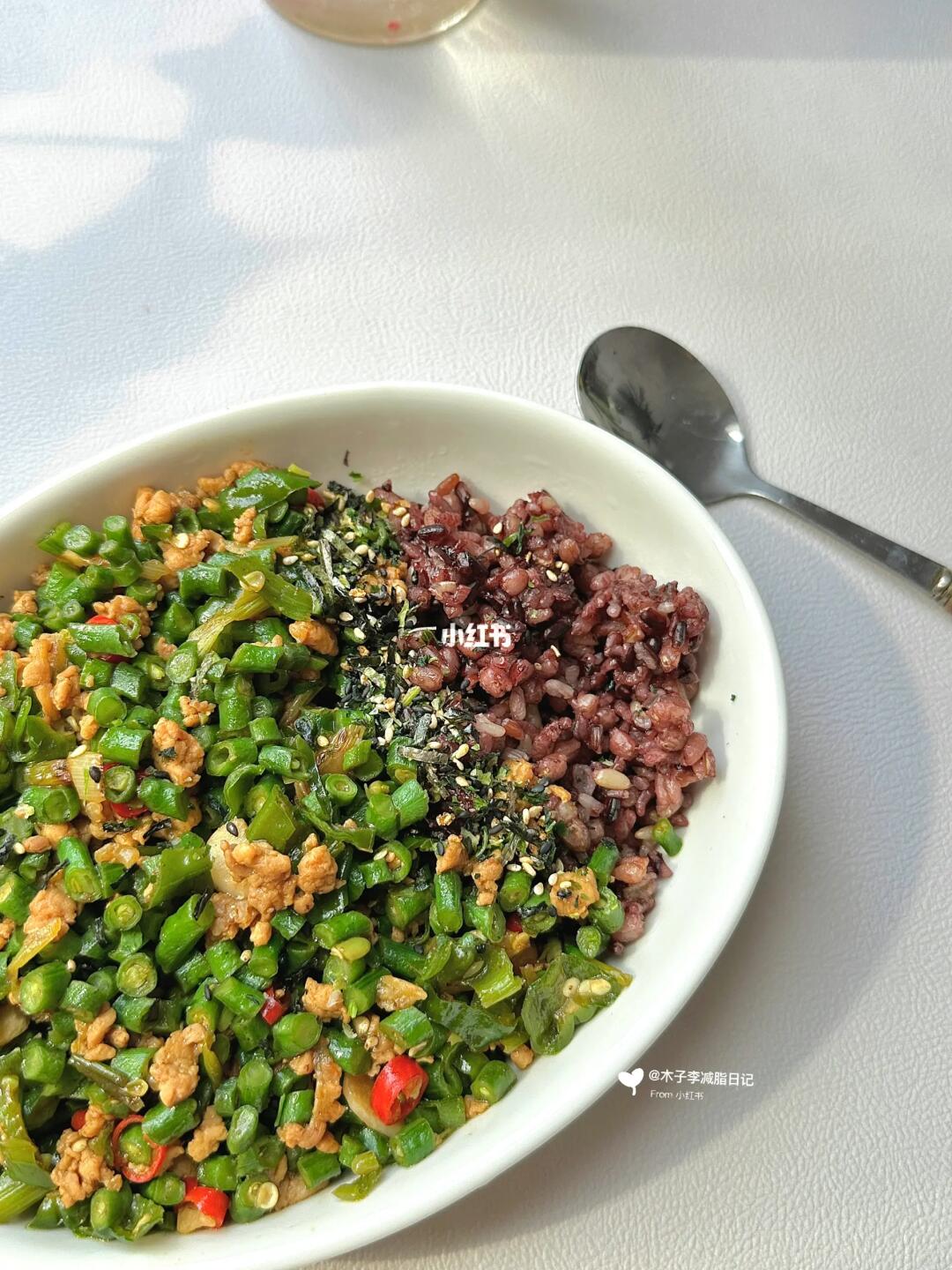 今日份午餐分享 豆角肉沫盖饭 柠檬🍋玫瑰菊花茶 - 假期过完 减脂也得提上日程呀!中午做个巨下饭的豆角肉沫!米饭用的杂粮饭 热量也不是很高!香香辣辣的老过瘾啦!每一口都满足呀😋 - 做法: 1️⃣豆角切丁,鸡腿肉剁碎。 2️⃣锅中油热放入肉沫炒散,放入生抽,老抽,炒熟盛出备用。 3️⃣锅中油热放入蒜,葱,小米辣炒香,再放入豆角青辣椒炒软。 4️⃣加入肉沫放耗油,丢丢盐调味翻炒均匀 5️⃣碗底铺上杂粮米,盖上豆角肉沫 撒了点海苔碎即可 - ~喜欢的姐妹赶紧去试试~