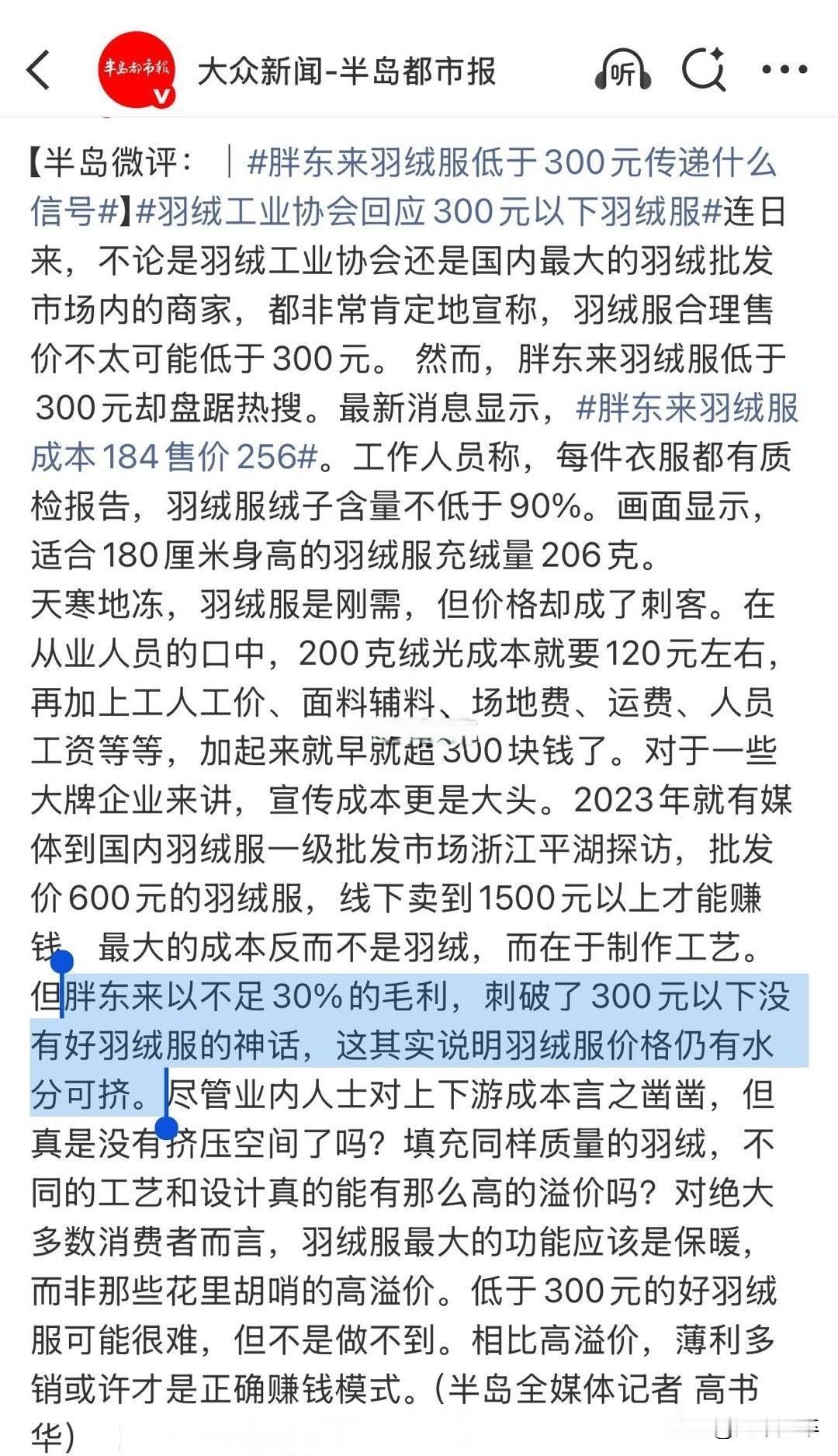 近期胖东来的羽绒服在其他品牌纷纷涨价的时候,因他家只卖256元冲上了热搜。 那他家的羽绒服为何会如此便宜了?是不是质量和其他品牌不同呢?以下是根据网络信息收集整理的资料仅供参考。 胖东来一件成本184元绒子含量不低于90%的羽绒服,售价仅256元,透明的定价重塑零售企业盈利逻辑。256元的售价对应约39%的毛利率,远低于行业普遍的50%-80%水平,胖东来是通过规模化采购与自营模式实现盈利平衡。依托源头直采优势,胖东来大幅压缩销售渠道的中间环节成本,胖东来自营品牌省去代理费用,且不投入高额营销(明星代言、广告投放),将隐性成本压缩至最低。同等品质羽绒服因中间商加价和品牌溢价,普遍售价超500元。 其次他家透明的定价更刺激了销量,每件羽绒服标签注明进货价、售价及毛利率(≤30%),加之每件羽绒服附带独立质检报告,明确标注绒子含量≥90%这更吃透了消费者的心里需求。透明的利润率和产品的质量保证,让消费者更加愿意去买单,这也说明了为什么现在有些人宁可找代购加价去买的原因。 在如今多数商家宣称300元无法购买到正行羽绒服的时候胖东来用256元定价证明这些人说的都是谎言,胖东来用大额订单推动上游工厂放弃“以次充好”,转而提升合规产能,形成“优质低价”的资金流的循环。胖东来的低价本质是供应链优化+诚信经营的体现。当行业沉迷溢价博利时,他用一场成本透明化销售行为证明了羽绒服无需天价,也能让消费者温暖过冬。。胖东来