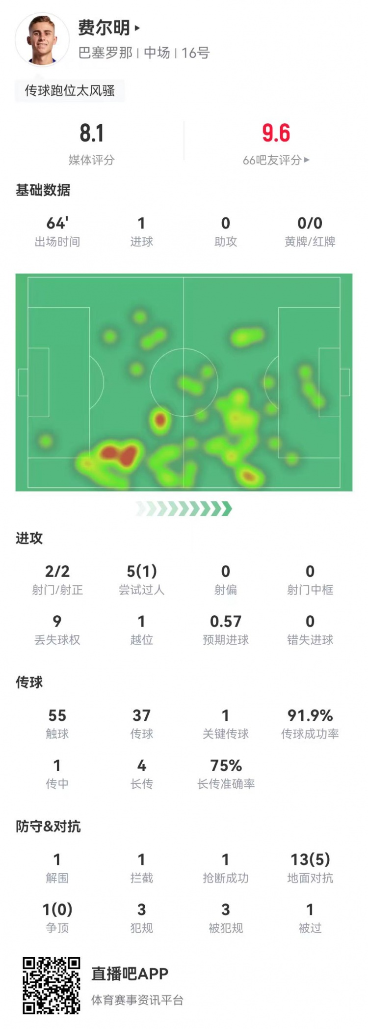 直播吧11月23日讯巴萨在本轮西甲3-0领先毕尔巴鄂竞技,费尔明本场数据如下: