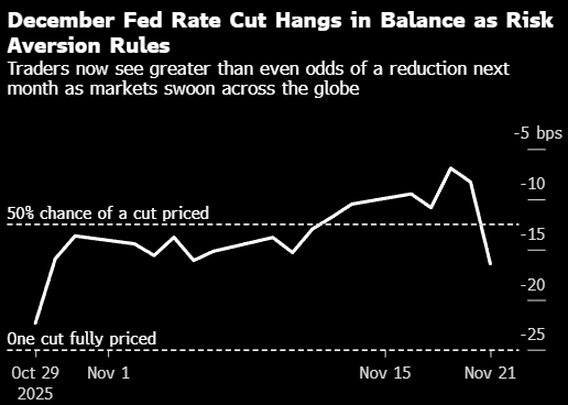 Collins是美联储10月会议以来多位表达类似担忧的决策者之一,这为将于12月9日至10日举行的联邦公开市场委员会(FOMC)会议埋下了分歧的伏笔。众多反对或对再次降息表示怀疑的观点导致投资者降低了对12月降息的预期。