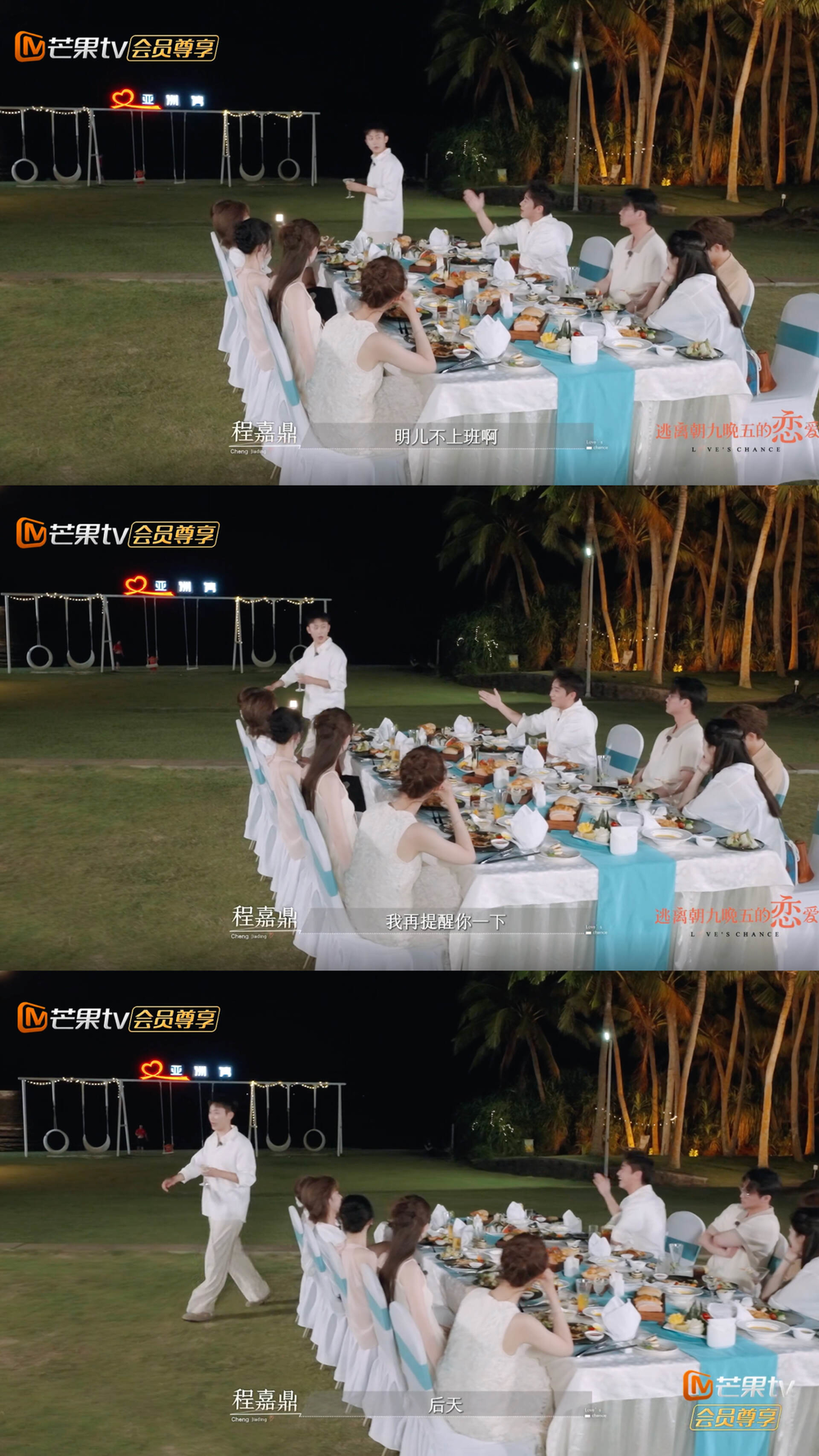 在第六期最后的沙滩聚餐时,大家正在感伤地谈论生活和未来。司文楷一句嘴瓢“明天上班”也在此刻达到杀伤力的巅峰,直接吓得程嘉鼎蹦起来,连连哄自己:“明儿不上班啊,我再提醒你一下,后天。”