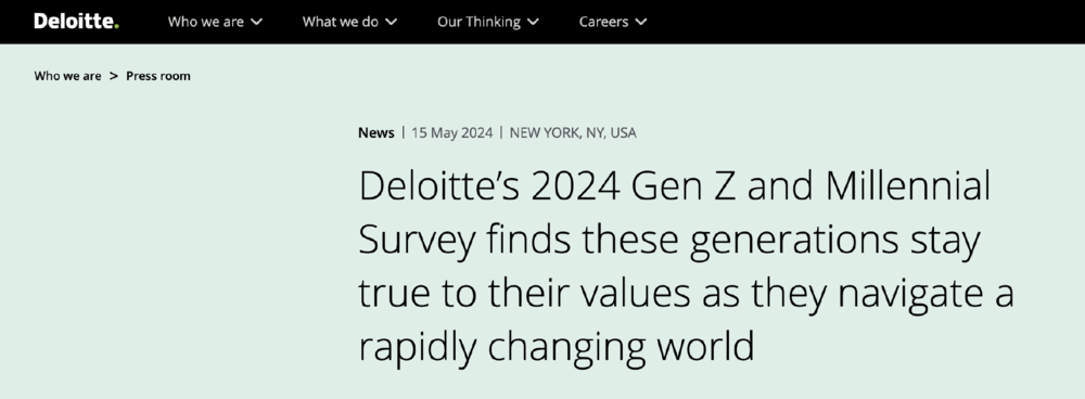 德勤在2024年的调查报告显示,高达40%的Z世代感到时时刻刻或大部分时间都处于压力之下,其中36%的人认为,工作是造成压力的主要原因。