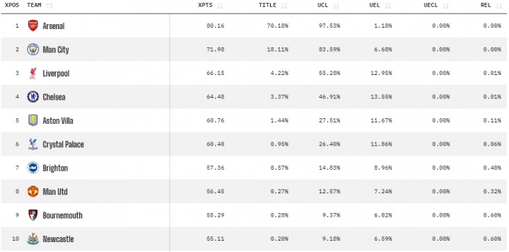数据机构Opta的大数据预测再度进行更新,目前英超各队的夺冠概率:阿森纳夺冠概率升至70.18%,曼城18.11%;利物浦4.22%,切尔西3.47%。该榜单的第5名为1.44%的维拉,其余球队夺冠概率均不足1%。