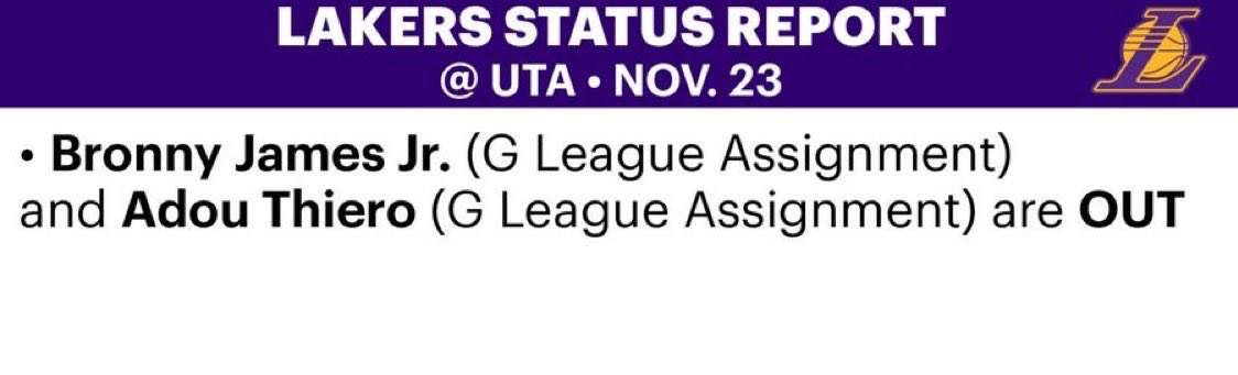 记者RyanWard报道,洛杉矶湖人队新秀布朗尼·詹姆斯和阿杜·西罗将缺席北京时间11月24日对阵犹他爵士队的NBA常规赛。