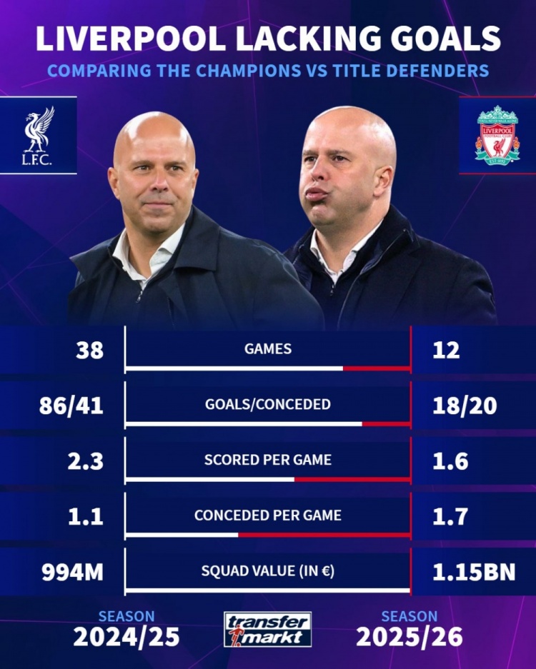 直播吧11月23日讯英超第12轮比赛,利物浦主场0-3不敌诺丁汉森林。德国转会市场统计了利物浦上赛季和本赛季的英超数据,并做出对比。