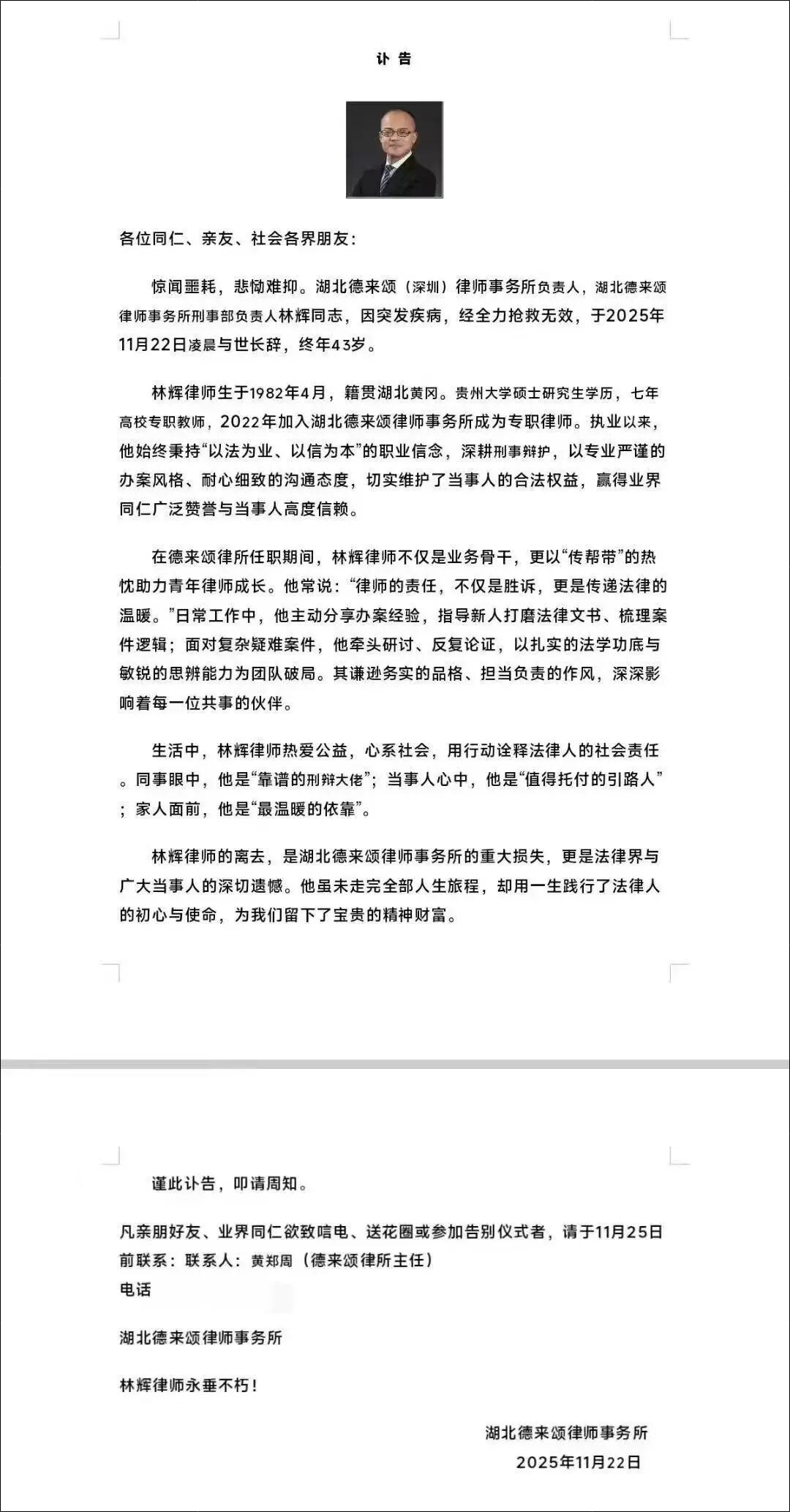 11月22日,湖北德来颂律师事务所发布讣告称,湖北德来颂(深圳)律师事务所负责人,湖北德来颂律师事务所刑事部负责人林辉同志,因突发疾病,经全力抢救无效,于2025年11月22日凌晨与世长辞,终年43岁。