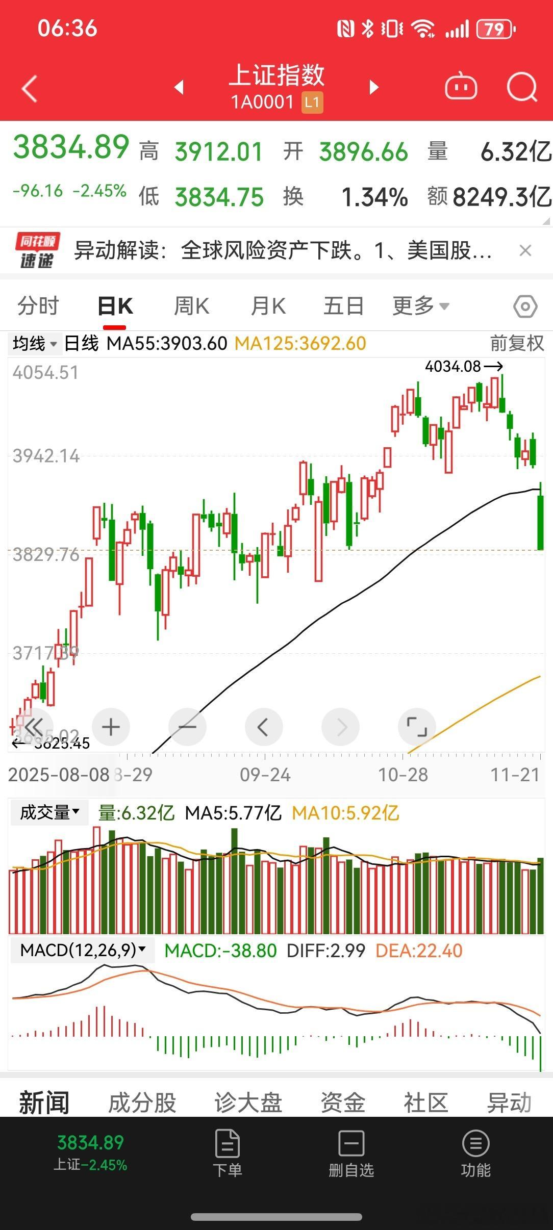 2025/11/23一周小结周五一根跳空大阴线,跌破60均线和3900颈线,确定了四浪调整的开始,下一步将考验3731和半年线的支撑。我的股票很多跌破60均线,半年线和年线,牛市趋势已结束,接下来操作以逢高减仓为主。本周收益-5.75%,本月收益-7.89%,今年收益23.26%。k线组合阴阴阳阴阴阴,“坤上艮下”的地山谦卦,是一个大吉之卦。它告诉你:当前的核心精神应是“谦”。· 对内:要如山一样,有主见,有根基,不动摇。· 对外:要如大地一样,平和、包容、不张扬。这样做,不仅万事亨通,更能赢得他人的尊重与帮助,从而获得长久的美好的结局(君子有终)。这是一个关于修养与成功的极高智慧的启示。