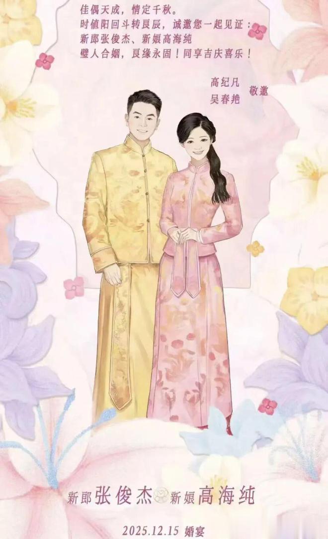 1、第一是霸王茶姬董事长和天合光能董事长喜结连理,网上流出的请柬文字部分写道“佳偶天成,情定千秋。时值阳回斗转良辰,诚邀您一起见证:新郎张俊杰、新娘高海纯璧人合姻,良缘永固!同享吉庆喜乐!”,并由高纪凡、吴春艳敬邀,明确了婚宴时间为2025年12月15日,体现出这场婚礼的庄重与喜庆,也表明了新人的身份以及邀请宾客见证幸福时刻的诚意。