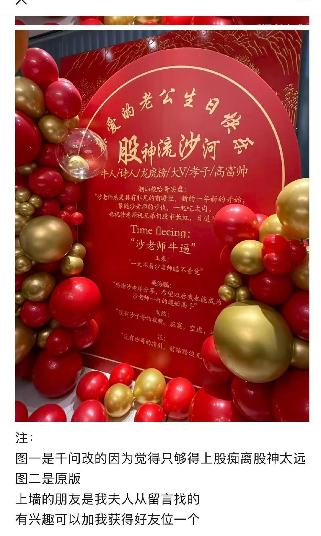 5、还有一个爱情是一线游资流沙河过生,牛市了,柚子赚钱了,流沙河的公众号图片显示,流沙河的妻子高喊股神、牛人、诗人、龙虎榜、大v、孝子、高富帅,感谢老公,虽然流沙河作为柚子很多人被割韭菜,但这个市场中正如主席说的需要国家队也需要短线柚子,人家没离婚,就是最大的道德。