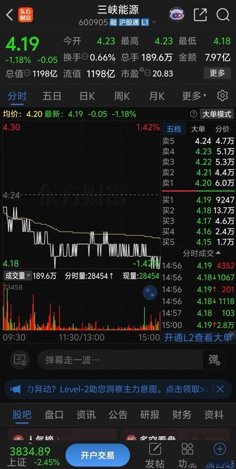 三峡能源再也坚持不住了,周五跌破4.20关口,按照之前的震荡行情在4.20会有很