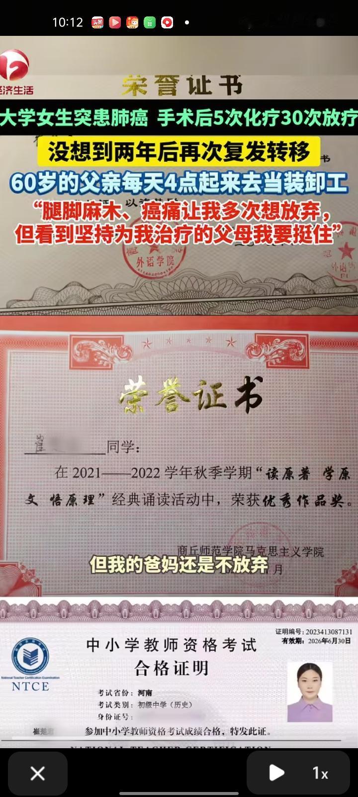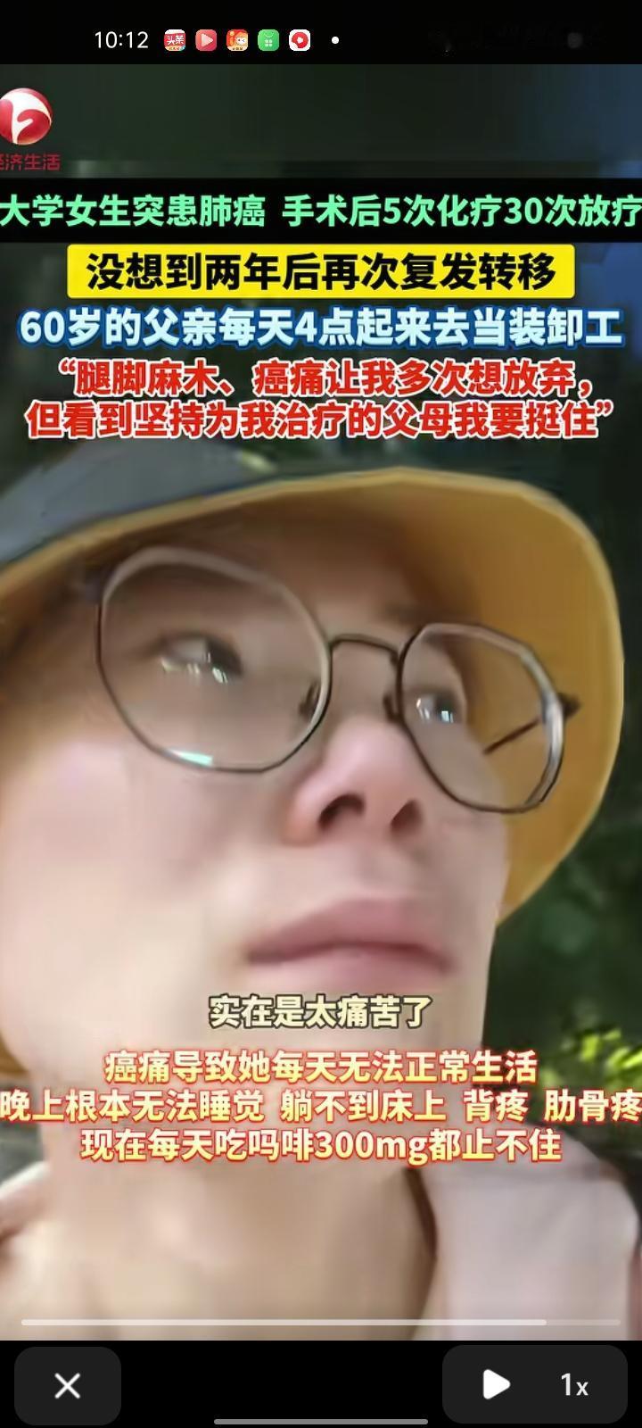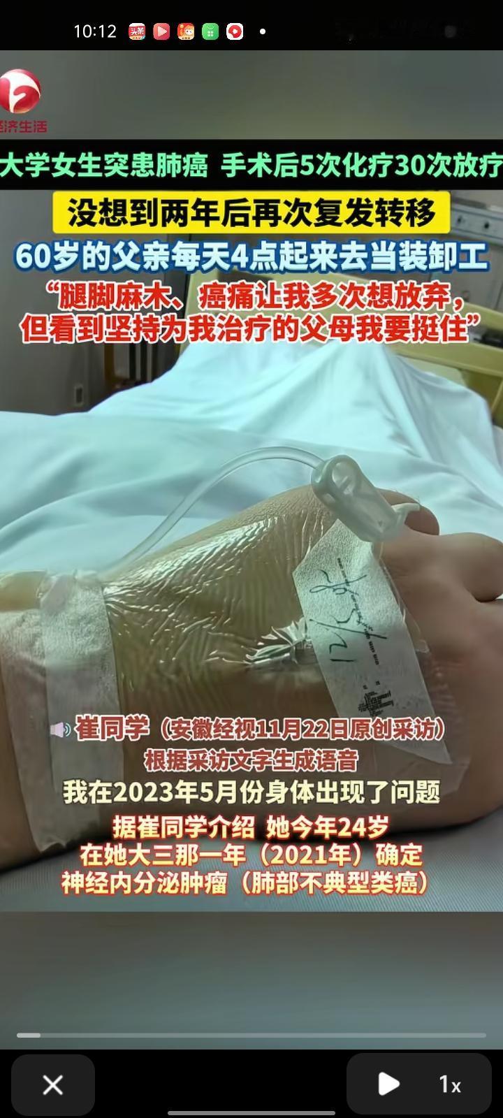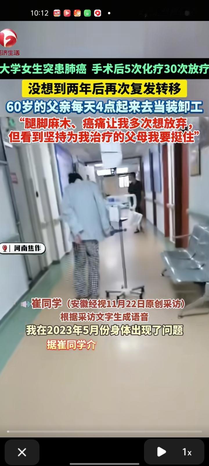 11月22日,河南焦作。女大学生读大三时被确诊为神经内分泌肿瘤,而且是中晚期。动完手术后进行化疗5次,放疗30次,手术加后续治疗费用花了近十万。开始医生说效果还行,她怎么没想到2023年5月又复发转移了。年迈的父母得她的病情后满是心疼,父亲每天四点起床当装卸工,晚上有时候半夜才回来,累到话都不想说。 该女生还说:“爸爸每天辛苦不要命地工作,却什么也不舍得吃,家里的鸡蛋都留给我,妈妈也是什么营养的东西都留给我 家里的亲戚劝他们不要再带我折腾,但我的爸妈还是不放弃。现在我腿脚麻木,24小时都在疼,晚上没法睡觉,躺不到床上,癌症让我多次想放弃,现在每天吃吗啡300克都止不住”。