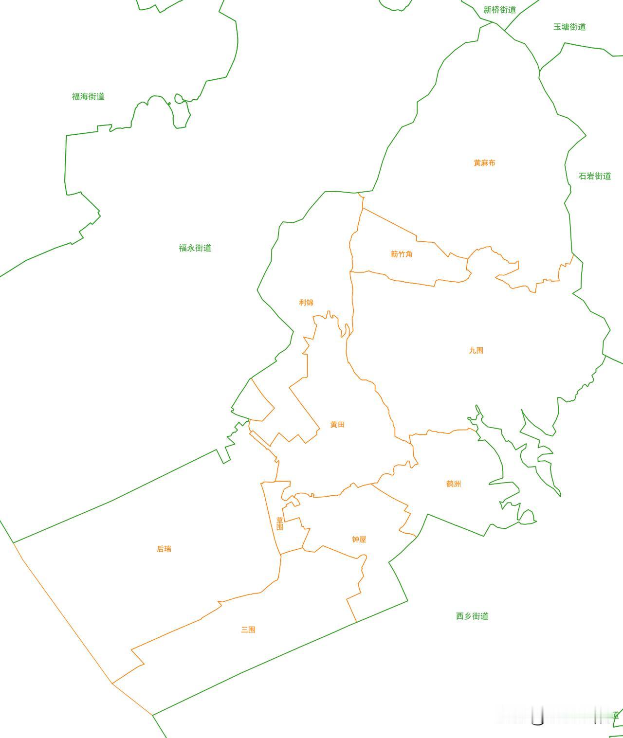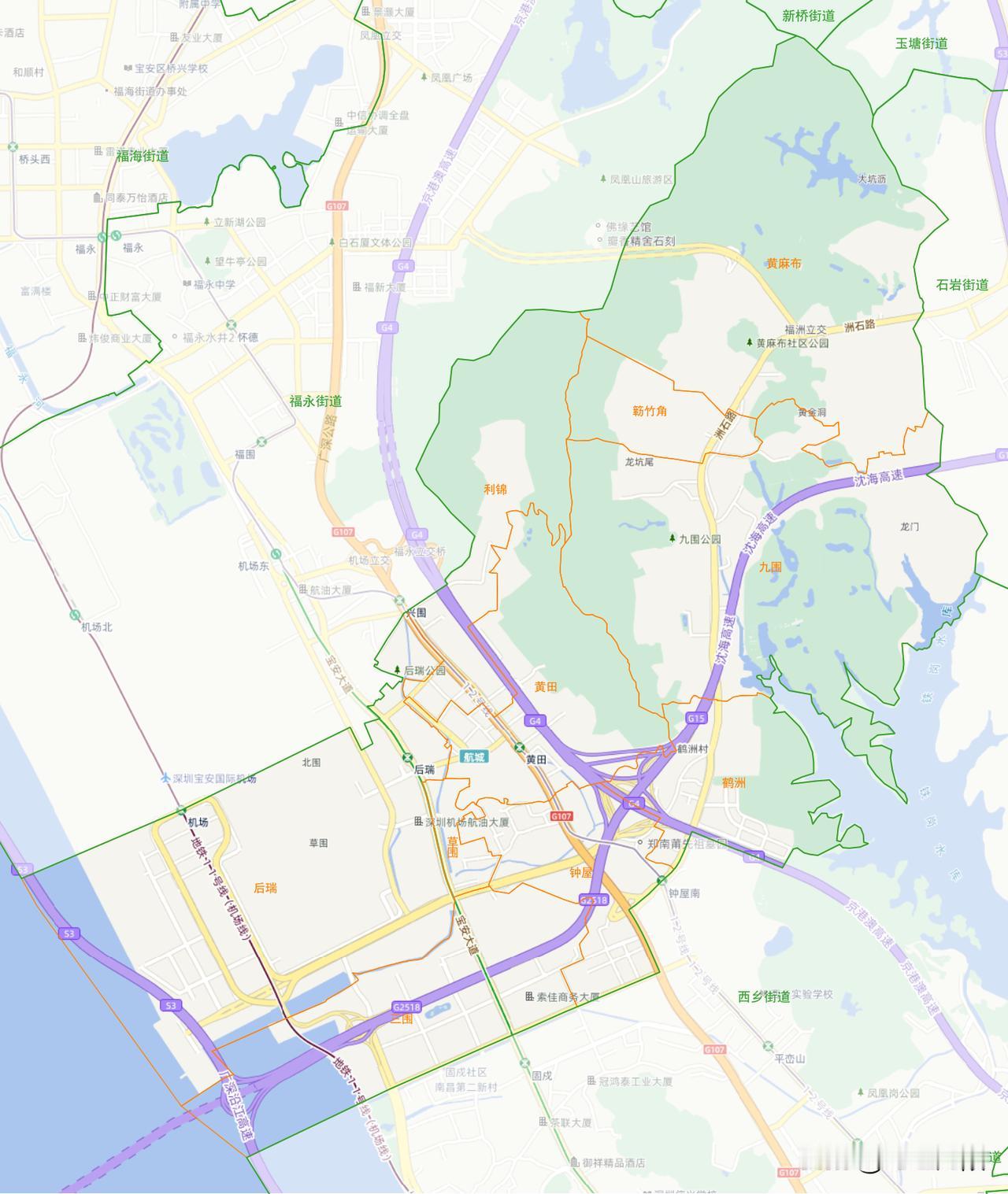 深圳市宝安区航城街道7个社区分布图 航城街道位于宝安区西南境内,东至石岩街道,南至西乡街道,西至珠江口,北至福永街道。管辖黄麻布、九围、黄田、钟屋、鹤洲、后瑞、草围、三围、利锦、簕竹角10个社区,面积45.62平方公里,总人口37万。