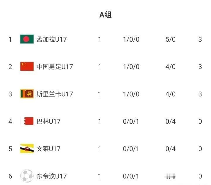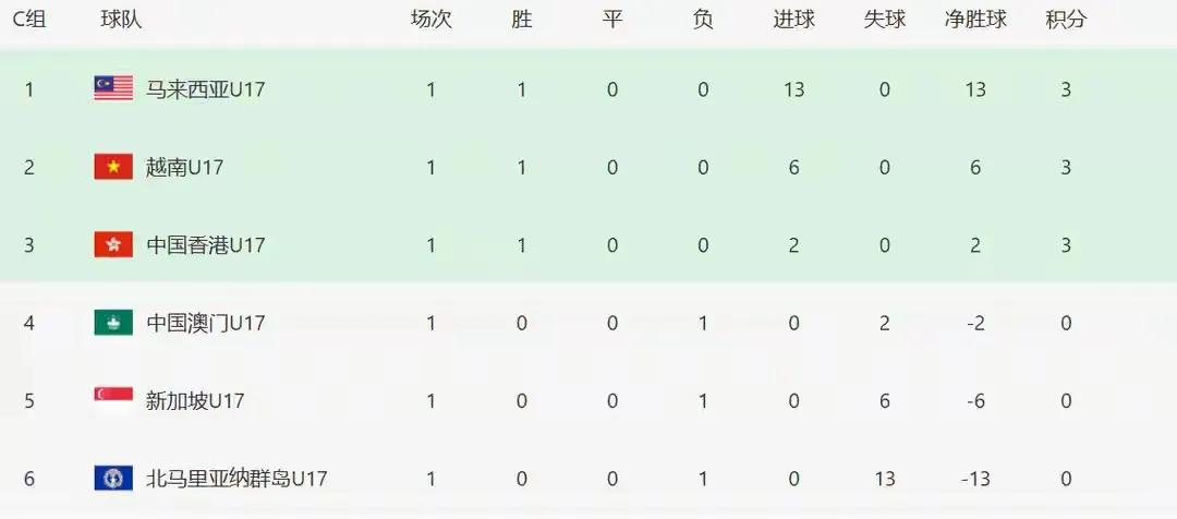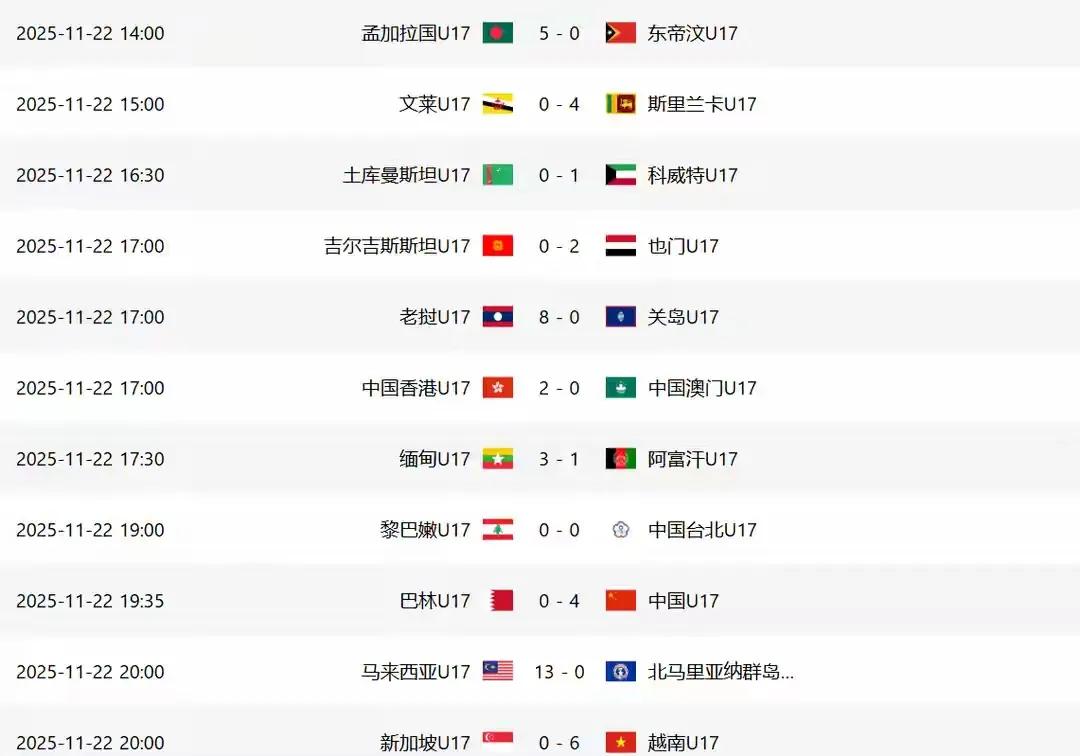 U17亚洲杯预选赛第一轮就酿惨案,第一轮最厉害的是东南亚马来西亚13-0北马里亚纳群岛,比上次中国U22进球还多,中国U22国青10-0北马里亚纳群岛。 越南U17以6-0大比分横扫新加坡队,越南青训进步明显,中国香港U17以2-0胜中国澳门U17,马来西亚U17凭借进球数优势暂列C组第1名。 G组的缅甸队3-1战胜了阿富汗U17,取得开门红;此前热身赛缅甸U17曾2-0爆冷击败中国U17国少。叙利亚U17队4-2战胜尼泊尔U17,暂时排G组第1名。 中国队所在A组:孟加拉国5-0大胜东帝U17,斯里兰卡4-0大胜文莱U17,中国队4-0巴林U17,孟加拉国净胜球优势排第1名,中国队暂时排第2名,这样看孟加拉国其实也不算太弱,中国U17下场将于24日打孟加拉国U17。 B组的老挝U17出人意料地以8-0狂胜关岛U17,老挝U17毫无悬念地占据B组第1名。 本届U17亚洲杯预选赛首轮就已出现多场大比分,且多数小组里球队实力差距显著,小岛小国太多,后续大概率还会频繁出现大比分惨案,本届预选赛仅小组第一名才能晋级正赛,这让强队遇到弱队时,不仅要赢球,还得争取更多净胜球,必然会“大开杀戒”!让我们拭目以待吧!