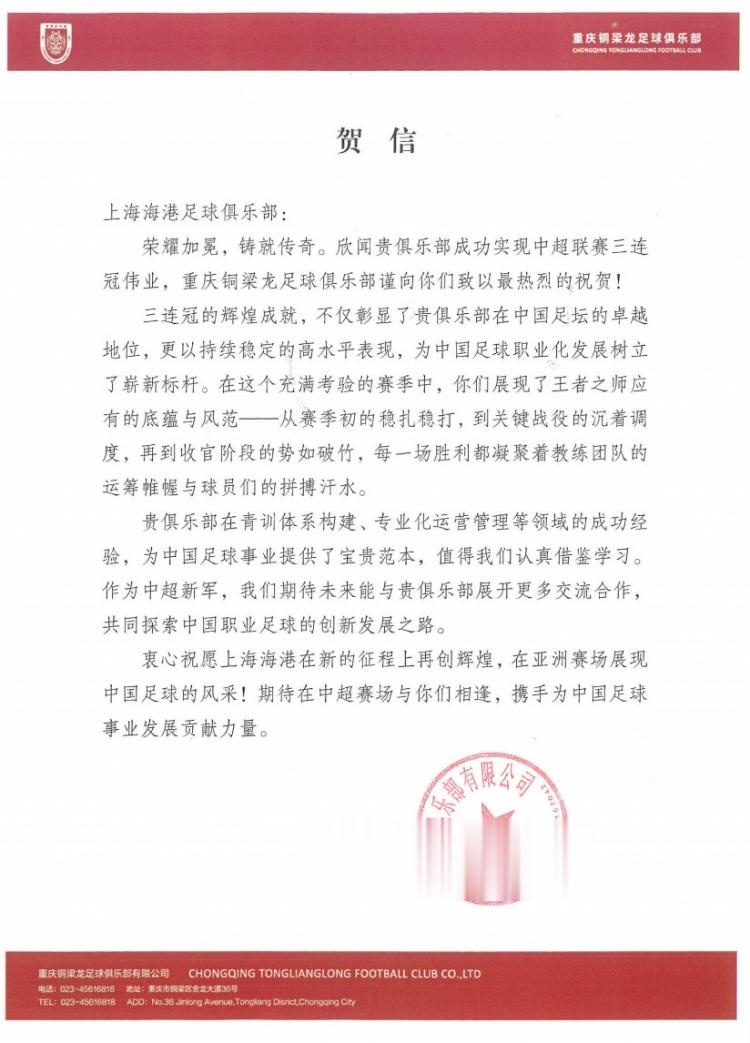 今日中甲亚军、升班马重庆铜梁龙通过官博发布贺信,祝贺上海海港取得中超三连冠。贺信写道: