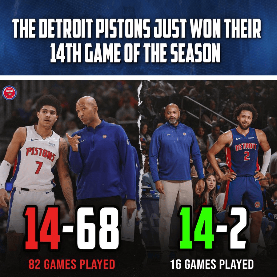 活塞开赛至今取得14胜2负,两年前常规赛总战绩为14胜68负
