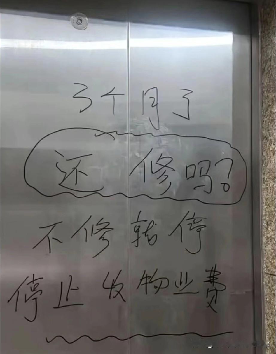 物业估计头都大了,业主的头更大! 刚进这栋楼,电梯门的字直接扎眼——“3个月了,还修吗?”下面跟着更呛的:“不修就停,停止收物业费。” 拽住个拎菜的大姐打听,她翻个白眼:“这破电梯三天两头卡,报修快仨月,物业就会说‘等配件’。我家老人住15楼,上周爬楼差点摔了!” 业主群里早炸锅:有人说“物业费白喂狗”,有人喊“集体拒缴”。物业那边回应“流程没走完”,可这门后的字,每笔都是攒了仨月的火。 你说,是业主写狠话太冲动,还是物业装聋作哑早该挨这“骂”?