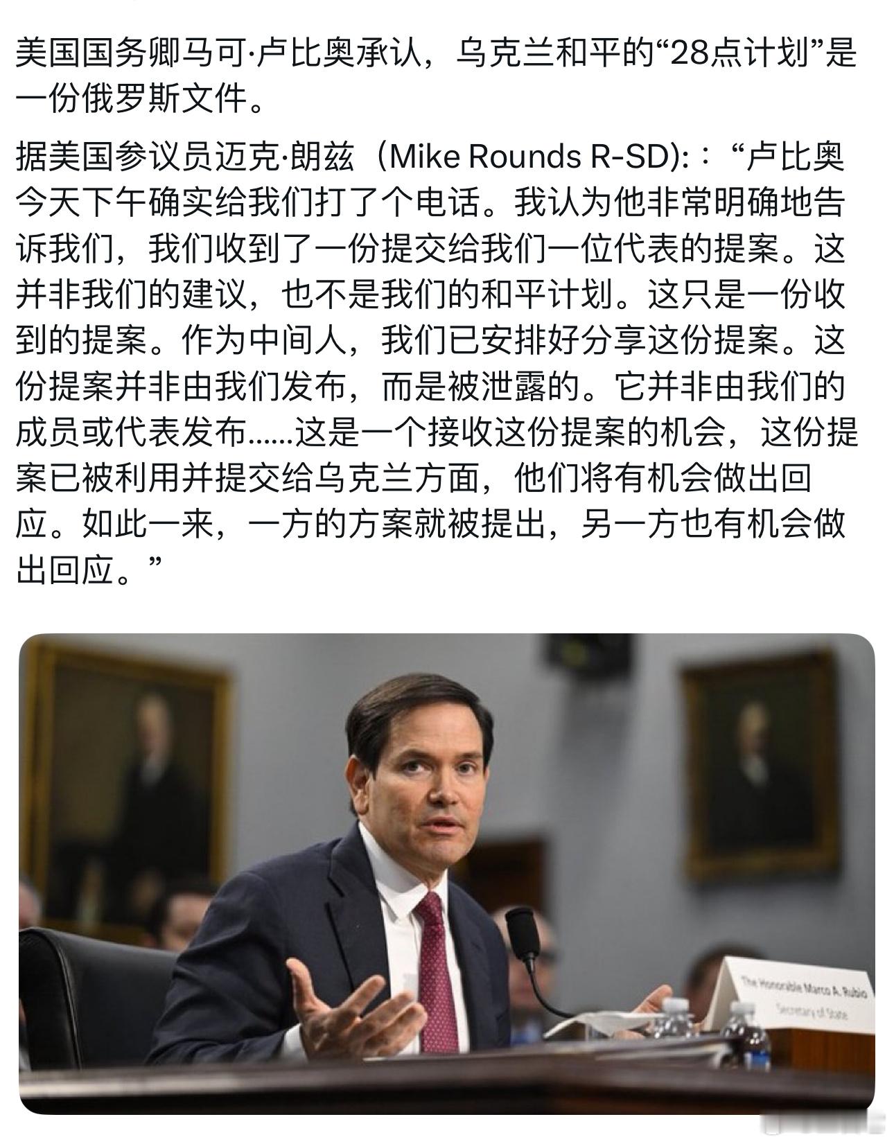 ‼️ 美国彻底帅锅把“28 点方案” 美国国务卿卢比奥澄清:这不是美国方案,这是俄罗斯写的提案,美国只是中间人——把俄方立场转交给乌克兰。 昨天川普明确对记者说对28条内容不知情。 全世界知道川普要求乌克兰一周年必须签字投降。 现在迫于全世界舆论压力慌忙跳出来:“不是我,是俄罗斯!我们只是递文件!”