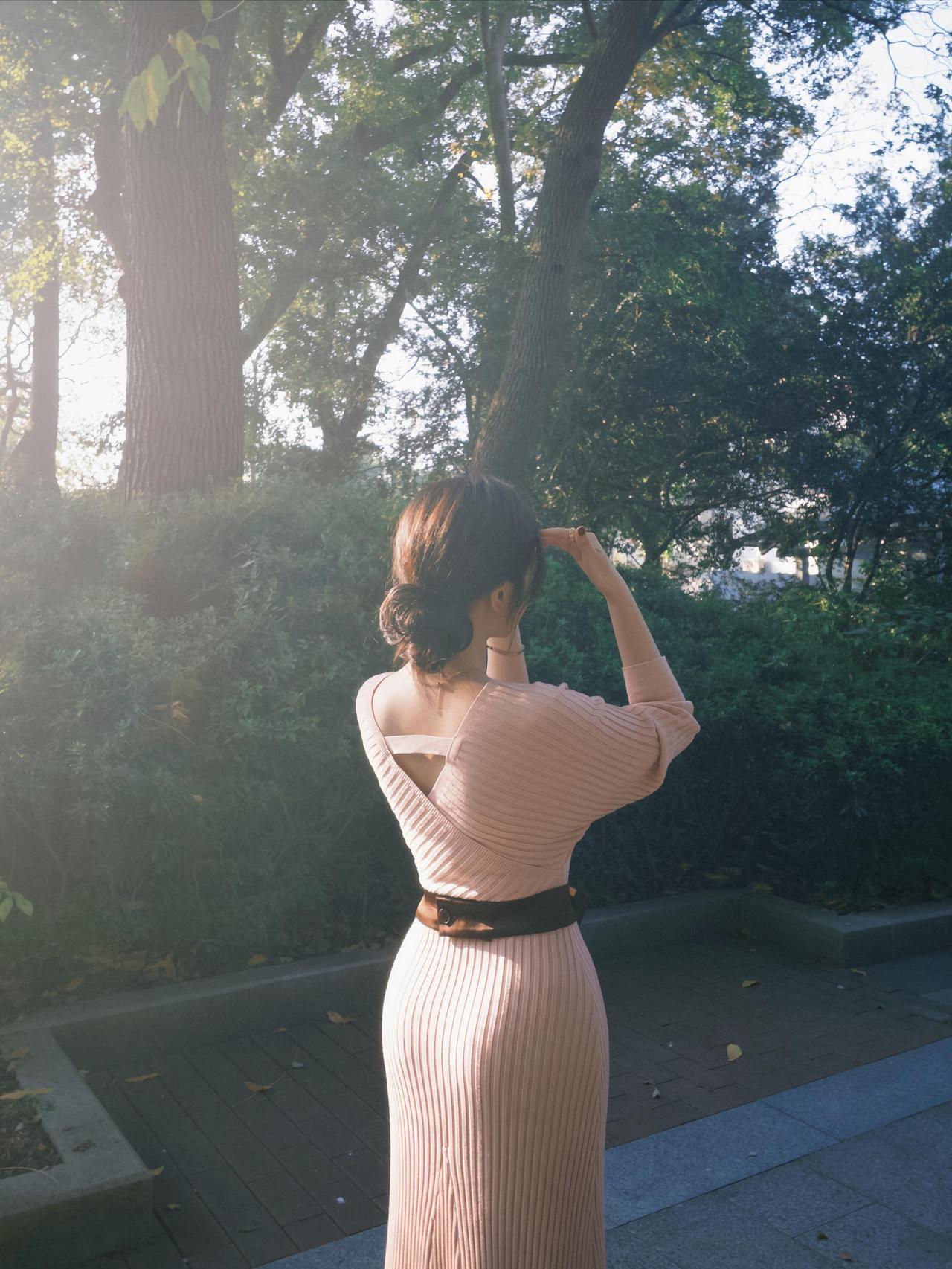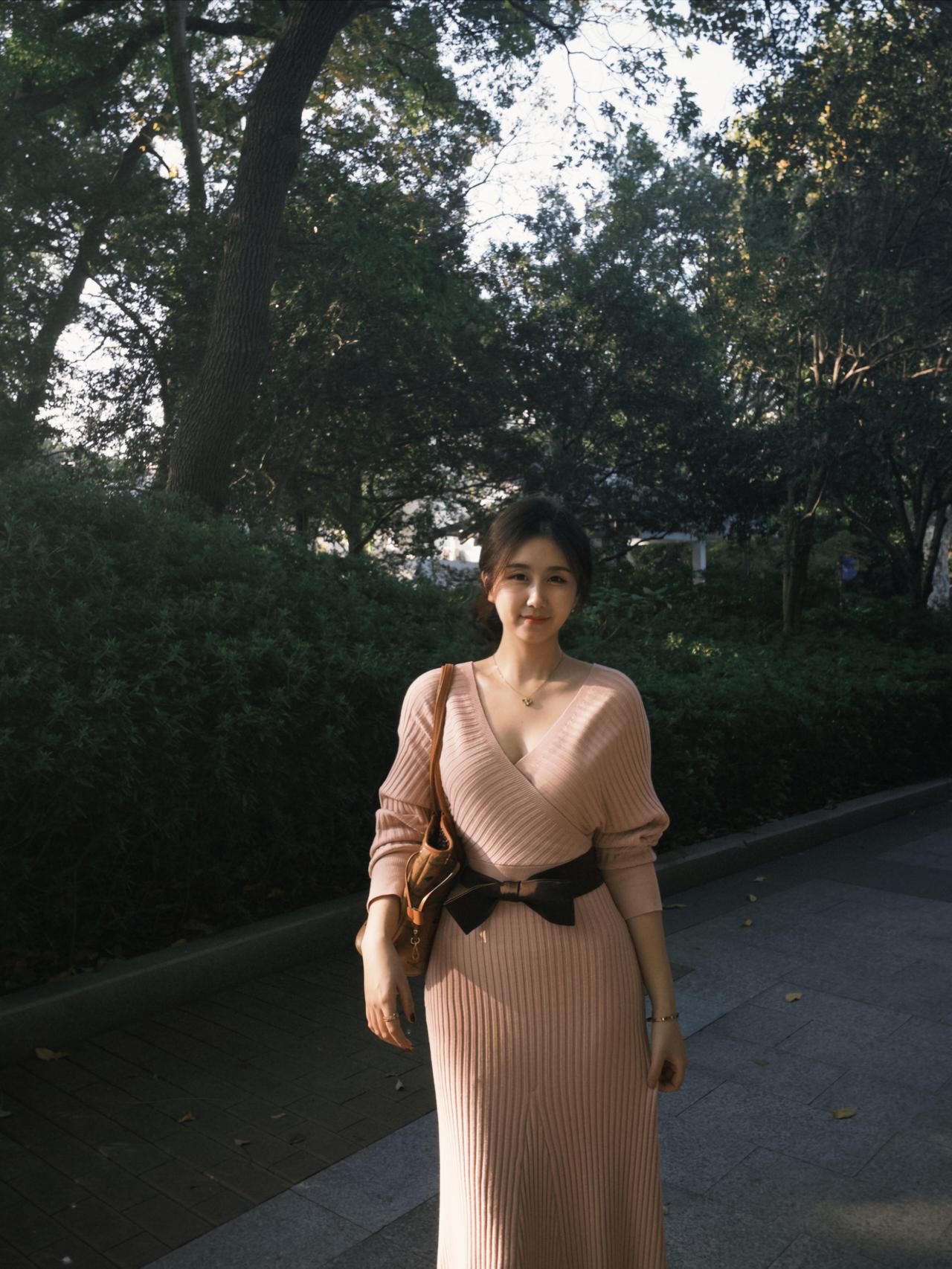 暮光漫过林梢, 粉裙漾起温柔的褶皱。 她立在树影斑驳的小径, 像一株含羞的合欢, 在风里轻轻摇曳。 低眉时, 裙摆掠过落叶, 指尖拂过发梢, 每一帧都是光阴写给秋日的私信。 光影流转间, 她与黄昏融成一幅静谧油画, 温柔了岁月,惊艳了时光。 = = = = = = = = = = = = = = = = = = = = = = 【秋日公园拍照心得:】 ①逆光选16:9构图,利用树叶间隙漏光营造氛围; ②俯拍蹲姿时让人物占画面1/3,地面落叶做前景; ③V领裙重点拍背部镂空,用侧逆光勾轮廓; ④最后统一加15%暖调滤镜,秒出温柔胶片感。