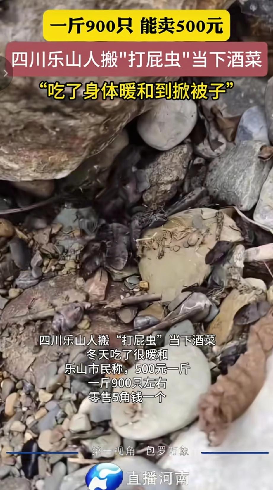近日在四川乐山“打屁虫”成为当地人喜欢的下酒菜,认为冬天吃这种虫子很暖和,甚至会暖和到掀被子。这种“打屁虫”主要在河边的石头底下翻开石头就能看见,在当地一斤大约有900只,能卖500元,零售的话5角钱一个,非常的畅销。(来源于@直播河南)