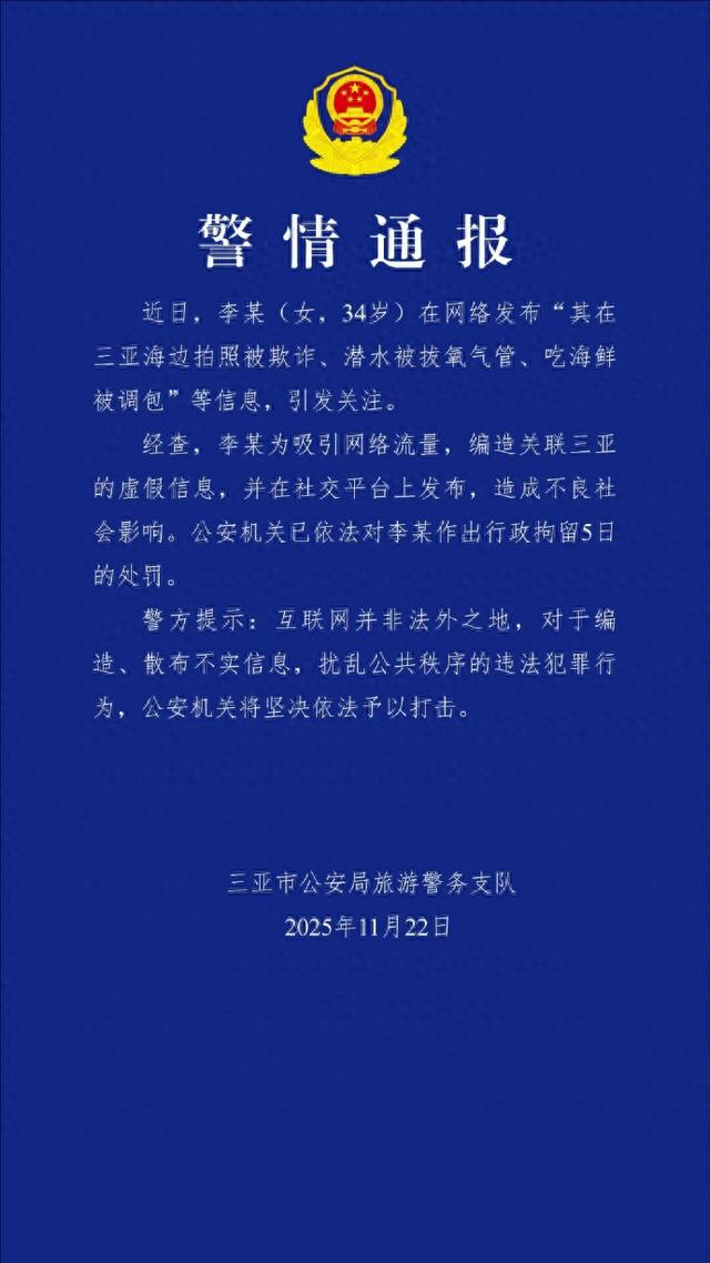 经查,李某为吸引网络流量,编造关联三亚的虚假信息,并在社交平台上发布,造成不良社会影响。公安机关已依法对李某作出行政拘留5日的处罚。