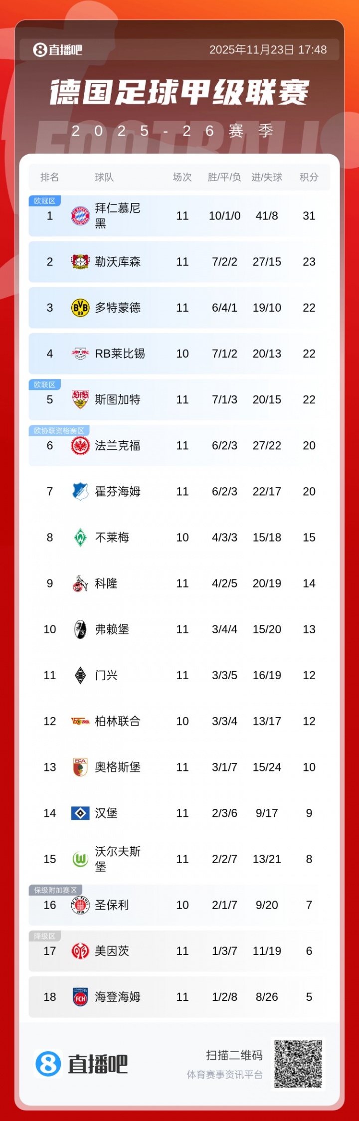 直播吧11月23日讯德甲第11轮,勒沃库森客场3-1轻取沃尔夫斯堡,排名上升到积分榜第2。