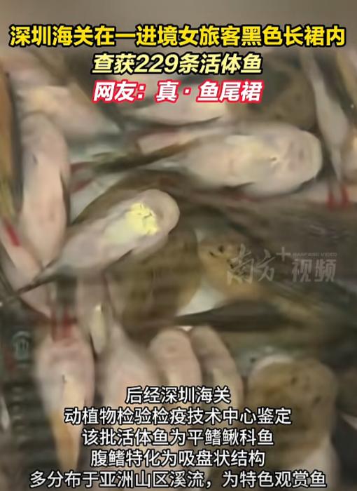 抓得好!深圳海关关员巡逻时,发现一女子的长裙不对劲,一般长裙会很自然的下垂,可这名女子的长裙鼓鼓的,特别是臀部周围,比普通人大了2圈,且走路神色紧张,关员果断将其拦下,核查后果然发现问题,在女子黑色长裙内发现用红色、白色塑料袋捆扎的疑似活体鱼2袋,共计229条。 这女子也是耍小聪明,认为将东西藏在隐私部位,就不会被人查!殊不知,海关关员每天守在进境口,来往旅客谁藏着“猫腻”,他扫一眼就能看出七八分。 视频里,穿黑色长裙的女子,走路姿势透着股别扭劲儿。虽然腰杆挺得像块板,却总下意识用手往裙子两侧按,完全没有正常走路的松弛感。关员凭着“火眼金睛”,立马觉得不对劲! 进了检查室,女子磨磨蹭蹭掀开裙子,露出来红白两个塑料袋,袋子里密密麻麻的小鱼正在扑腾,肚子上还带着吸盘似的东西,牢牢吸在袋壁上。 数数下来,两袋足足229条!后来送深圳海关检疫中心一鉴定,确认是平鳍鳅科鱼——这鱼看着不起眼,却是观赏鱼市场里的“小众网红”,据说品相好的一条能卖几十块。 藏烟酒、藏化妆品的见多了,把活鱼捆裙子里的,真是开眼了,这要是闷坏了,不光鱼废了,人也得遭罪啊! 为了赚俩钱是真拼啊,活鱼在裙子里闷着不缺氧?幸亏被抓了,不然生态和人都得遭殃!之前见过藏手表的,藏活鱼还是头一回,离谱他妈给离谱开门——离谱到家了! 有人嘴碎:“不就是几条小鱼,至于查这么严?” 这话可错大了!外来物种入侵的破坏力,比咱想的恐怖十倍。 平鳍鳅看着小,却是溪流里的“霸王”——老家在亚洲山区急流里,肚子上的吸盘能吸住石头不被冲走,啃食藻类和小型生物的本事一流。要是溜进咱本地的河流、水库,没有天敌管着,不出半年就会疯狂繁殖,把本土鱼虾的食物抢光,还霸占石头产卵。 南方人都知道福寿螺的祸害,啃水稻、毁莲藕,本来是当“美食”,结果在野外泛滥,平鳍鳅要是泛滥,后果一个样! 这事儿也给大伙儿提了醒:进出境别抱“查不到”的侥幸,不管是活鱼、水果还是种子,拿不准能不能带就问海关,别觉得“带一点没事”——你眼里的“小玩意儿”,可能是生态的“大祸害”。 为罗湖海关的“火眼金睛”点个赞! 女子裙内藏匿229条活鱼被海关查获
