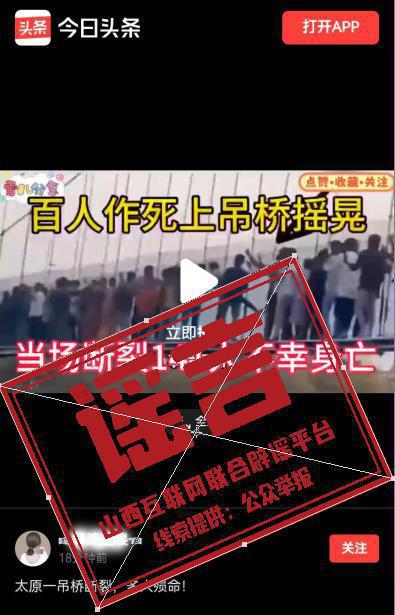 11月23日,一网民在今日头条发布“太原一吊桥断裂,多人殒命!”的视频。经核实,太原无类似吊桥。该事件发生地并非太原,为不实信息。