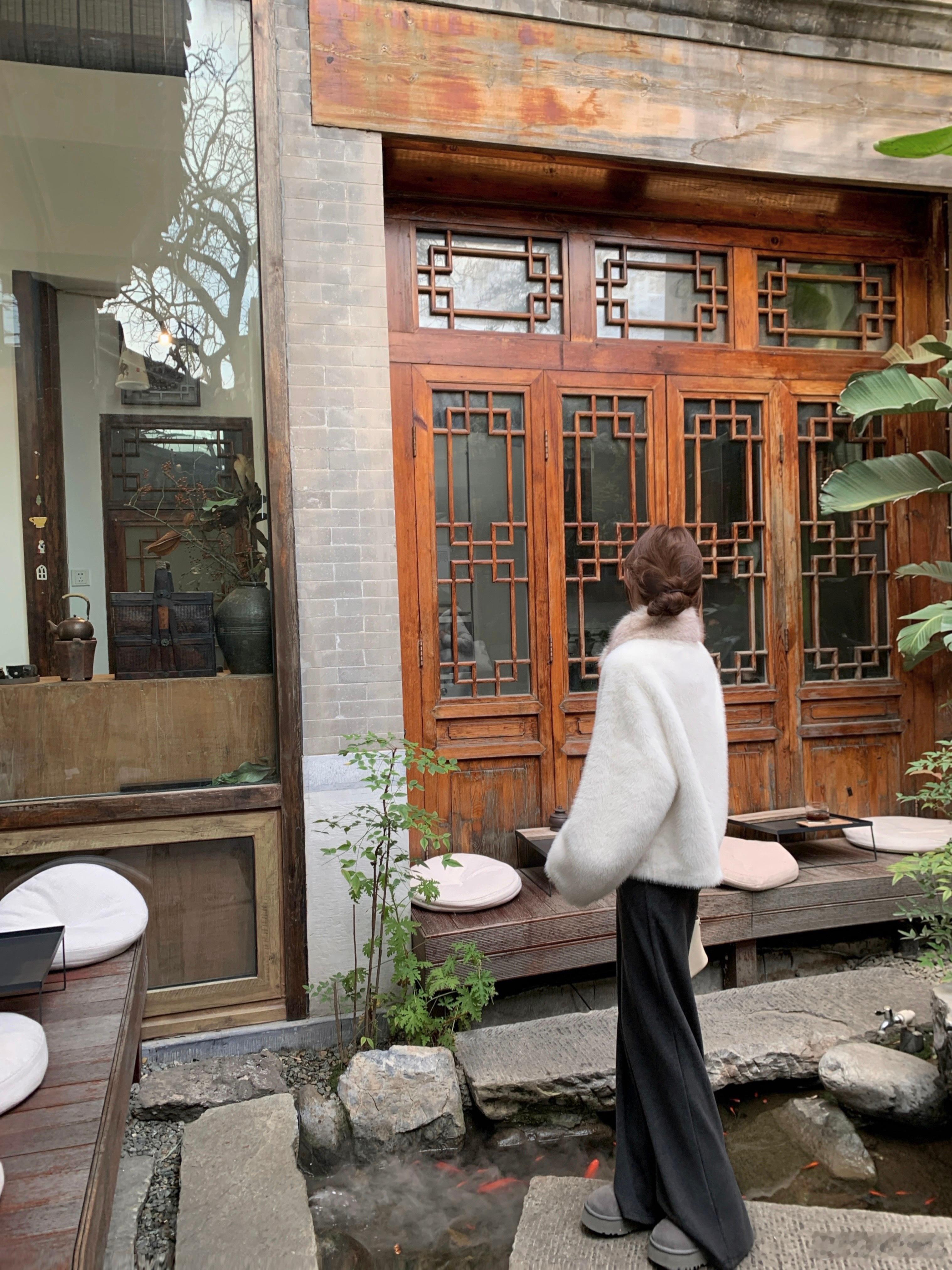 她身着绣金繁花的绸缎裙,轻纱袖摆漾着温柔,同色系高跟鞋衬得雅致。在轻奢空间里,将