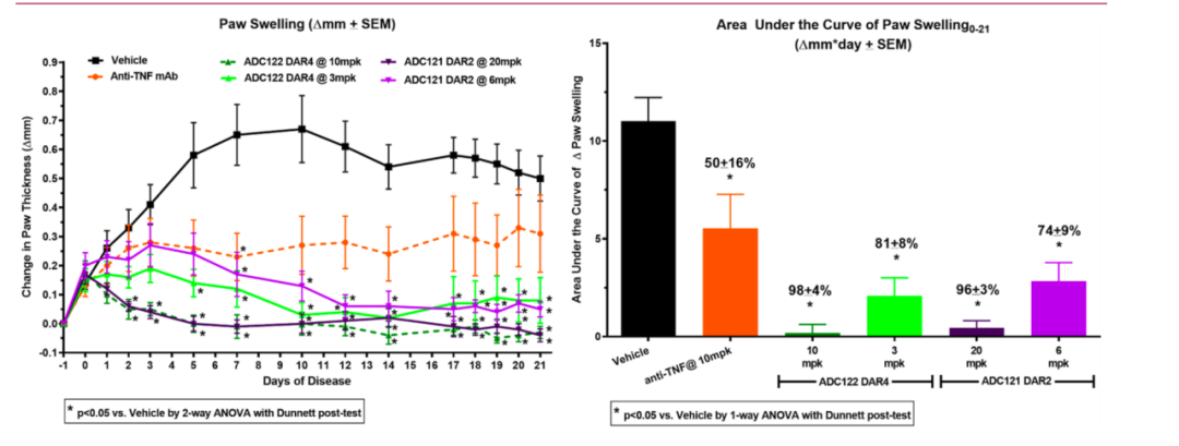 在mCIA模型中,单次给药后所有四种ADC的足部肿胀减轻效果均持续超过30天。且所有ADCs的疗效均显著优于母体单克隆抗体(阿达木单抗)。