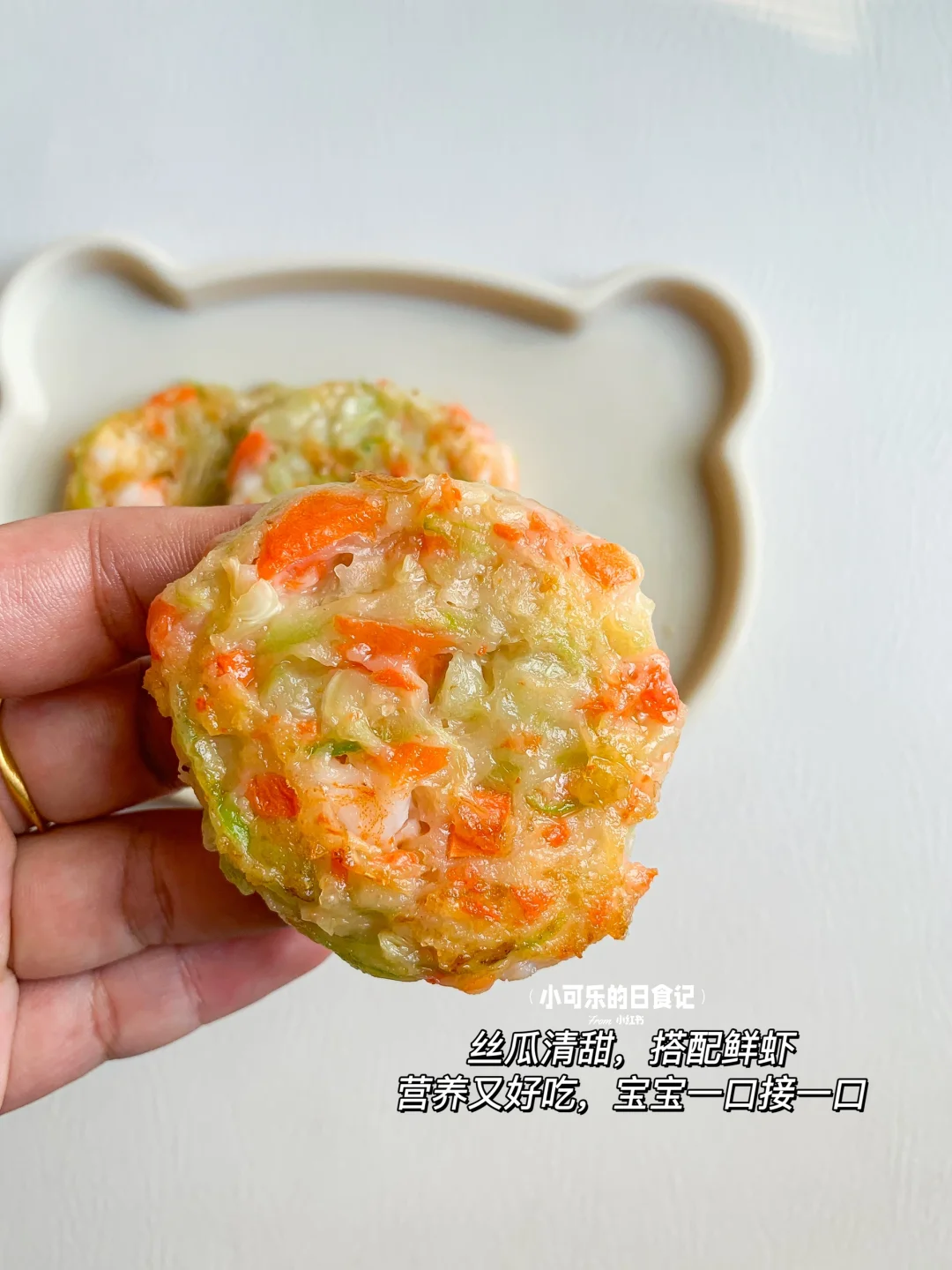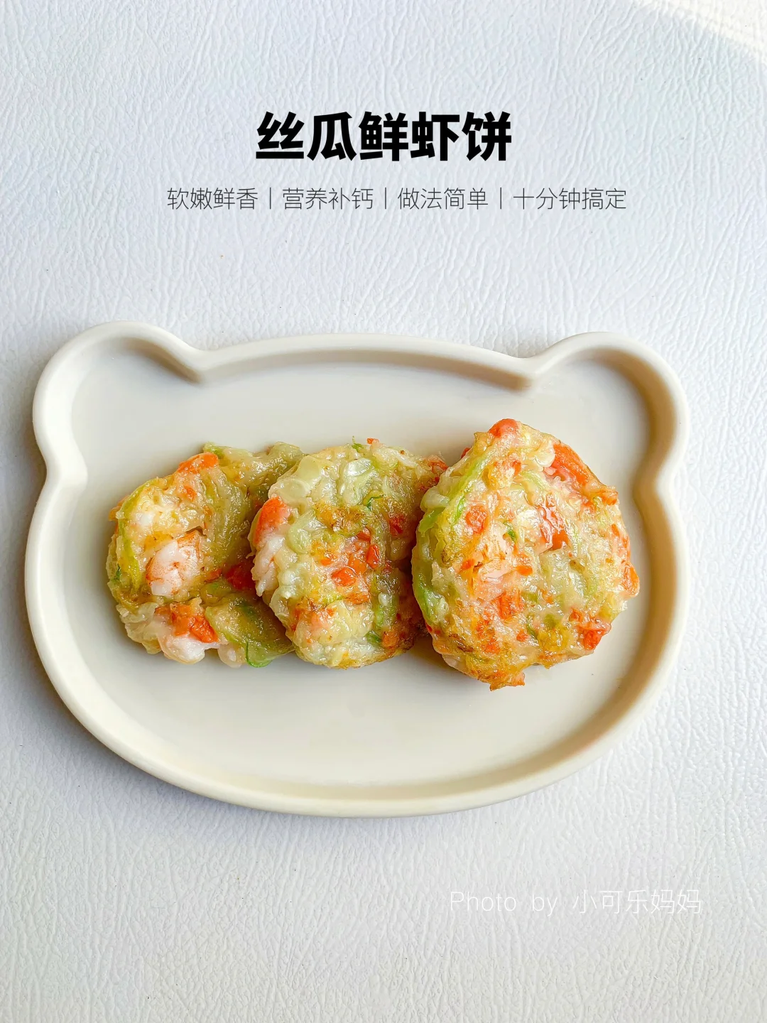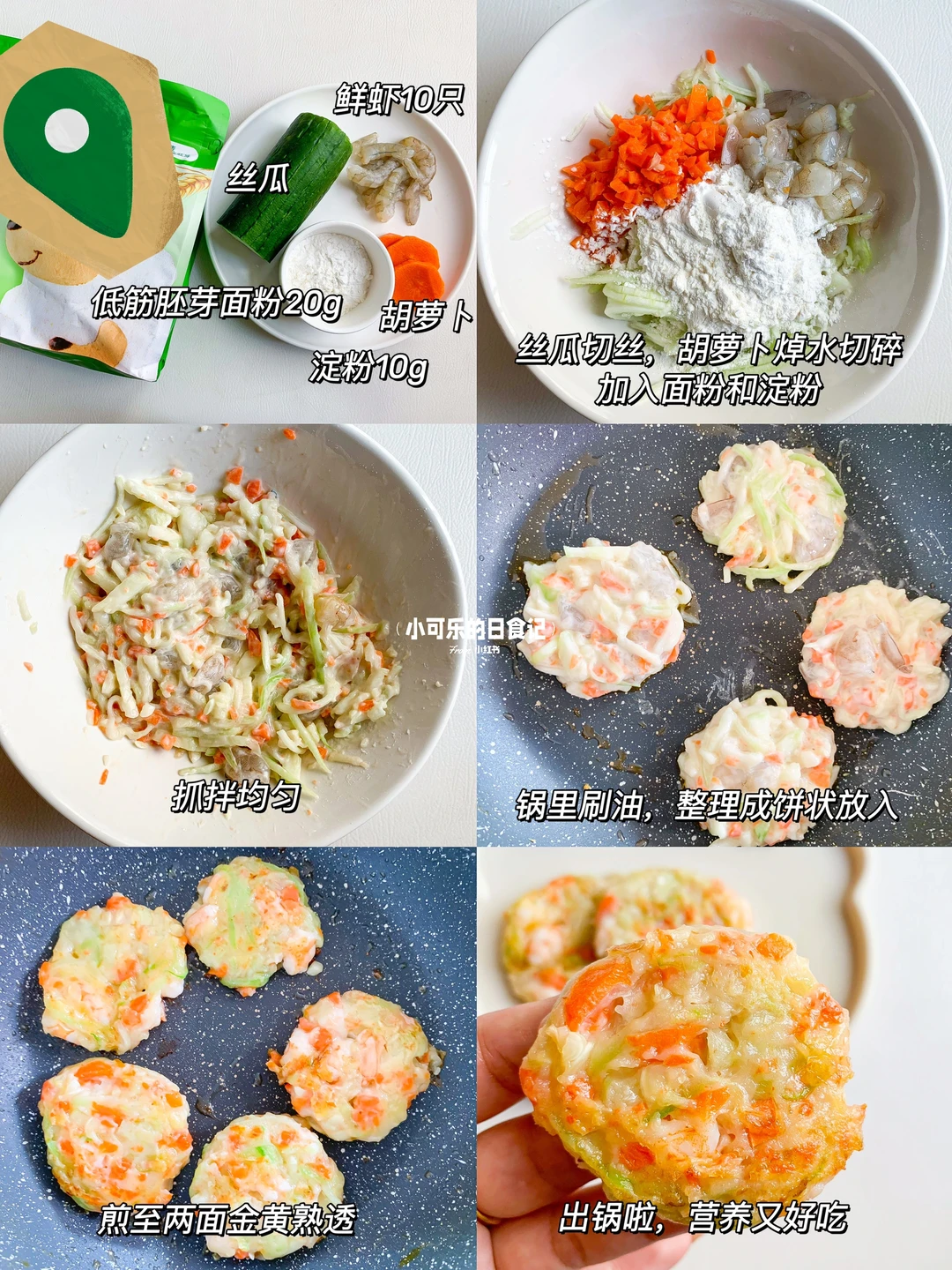 今天分享经常会给宝宝做的丝瓜鲜虾饼,丝瓜清爽不腻,又富含维生素,搭配满满的虾肉,软嫩鲜香易咀嚼,营养补钙又好吃,做法简单,妈妈们快给宝宝安排吧 - 🌟食材: 丝瓜 虾10只 面粉20克 淀粉10克 胡萝卜 🌟做法: 1⃣️虾仁切小丁加姜片腌制去腥,胡萝卜焯水切碎,丝瓜切丝。 2⃣️所有食材加入面粉,淀粉一起搅拌拌匀(一岁以上宝宝可加点盐调味) 3⃣️锅中刷油,手沾水整理成饼状放入锅中,小火煎至两面金黄熟透即可~