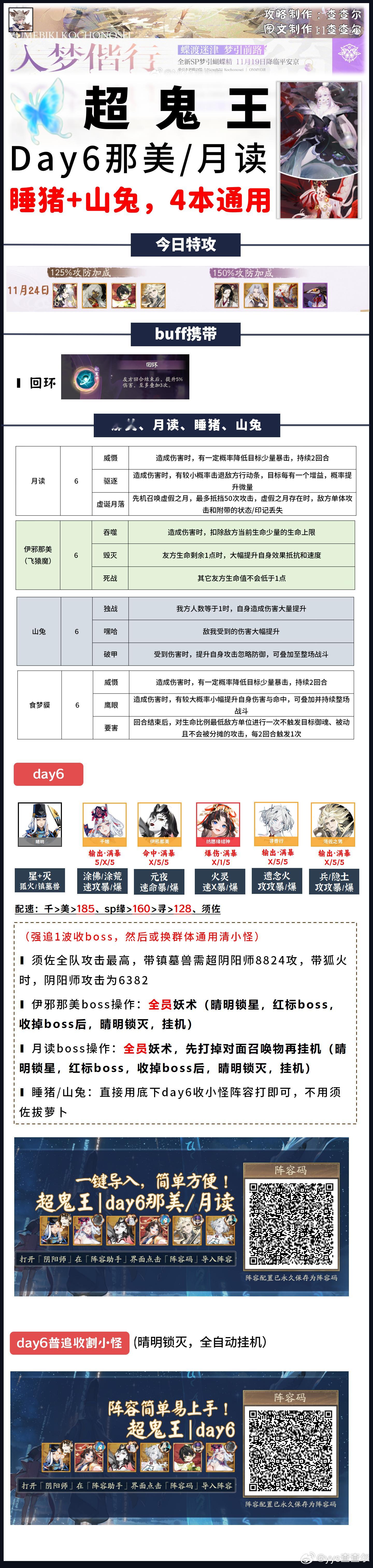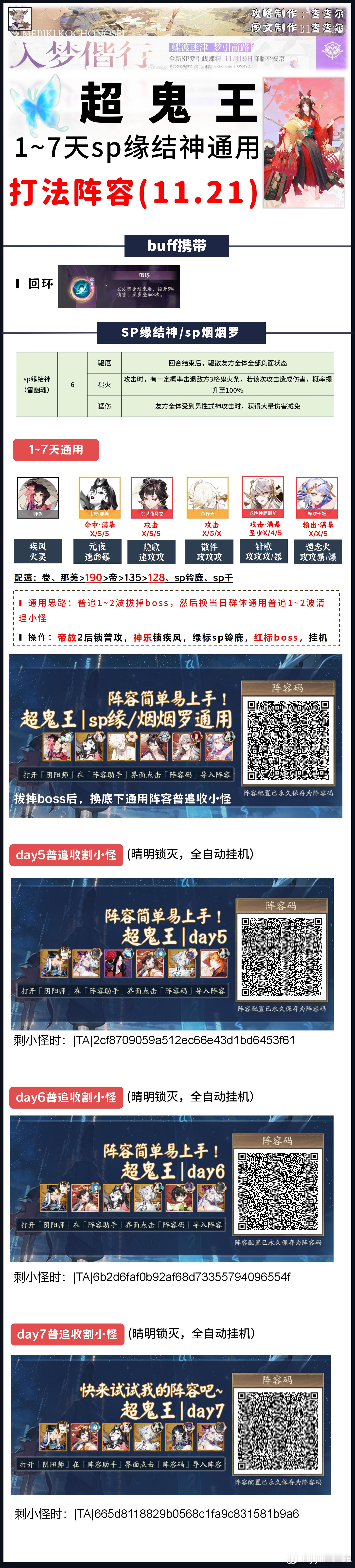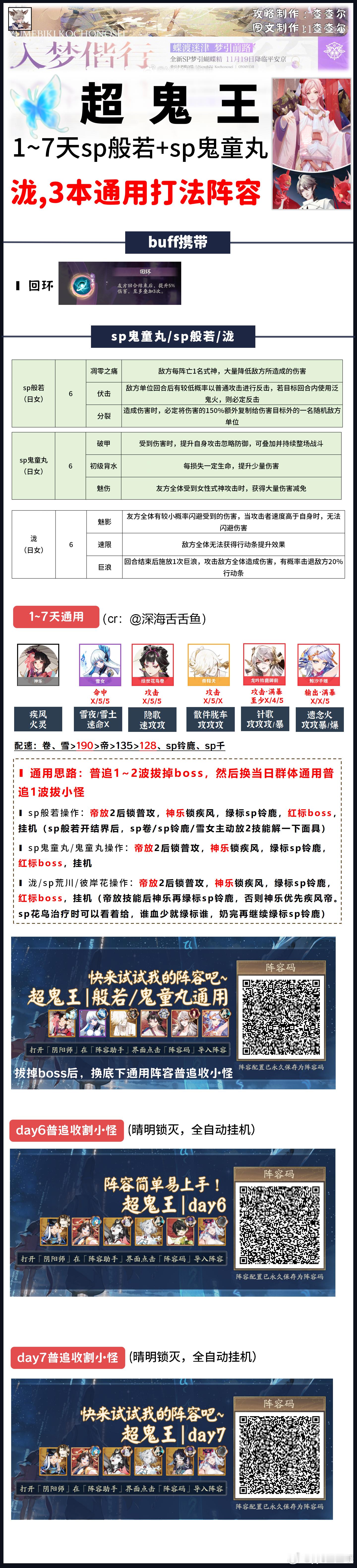 【超鬼王】dya6全鬼王阵容+阵容码一键配■今天主力特攻是须佐和sp草。须佐1强拔高星boss,然后换sp草1普收小怪(sp草可换ssr叉姬,不推荐sp叉姬,动画慢且多动容易卡火)■今日进一步优化了帝卷拔主怪阵容的配置,优化了打sp岳阵容中sp草的配置day6:1~4星+5、6星清小怪+山兔/睡猪通用普追:|TA|034460b59d7deb7822feb08db34663b55星+部分6星:①鬼童丸/sp鬼童丸/sp般若/泷/sp荒川/彼岸花|TA|0a3faa9ddddefe6360a6084d75c59376②sp九命猫/那美/月读|TA|2a4f77b4bbeec45fbb2e8f2b0ffc5c7asp烟烟罗/sp缘结神|TA|3480095f2bfeeedd895fe670179a22e2④sp灯/鬼金羊|TA|bb802426a842b6a3339738dc8cae48a2⑤封阳君/山风|TA|aca64e2c690a46cbc98110701f1618e8⑥御馔津|TA|fd8a57f31b5ff2819598cdefcb9b7191⑦铃彦姬|TA|f8b5a3bed5b5071ae720333489394110⑧荒骷髅|TA|873f0bf6b8c129f3214530a5ef1db0186星:sp不见岳|TA|08d4456b0083824b27cba3b3a75e61c4平将门|TA|5deedbb0b426992d3b863e0ad9d370d1