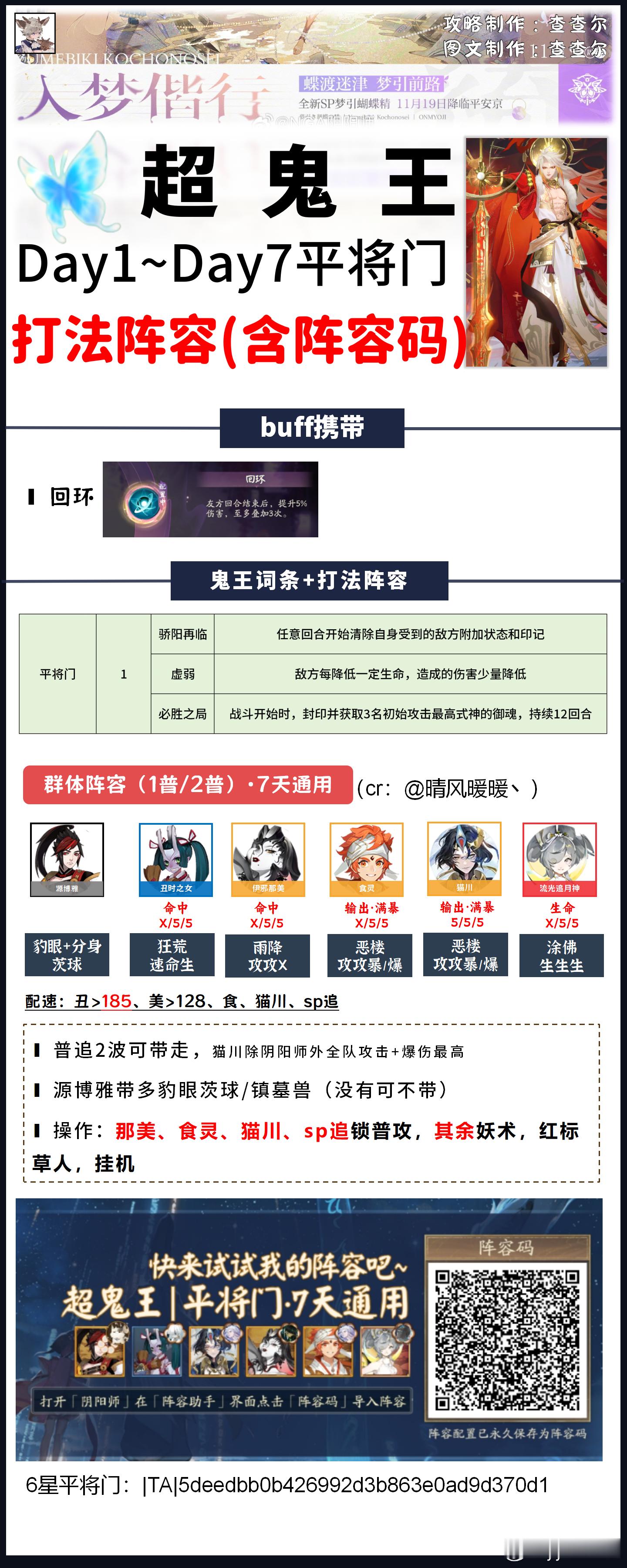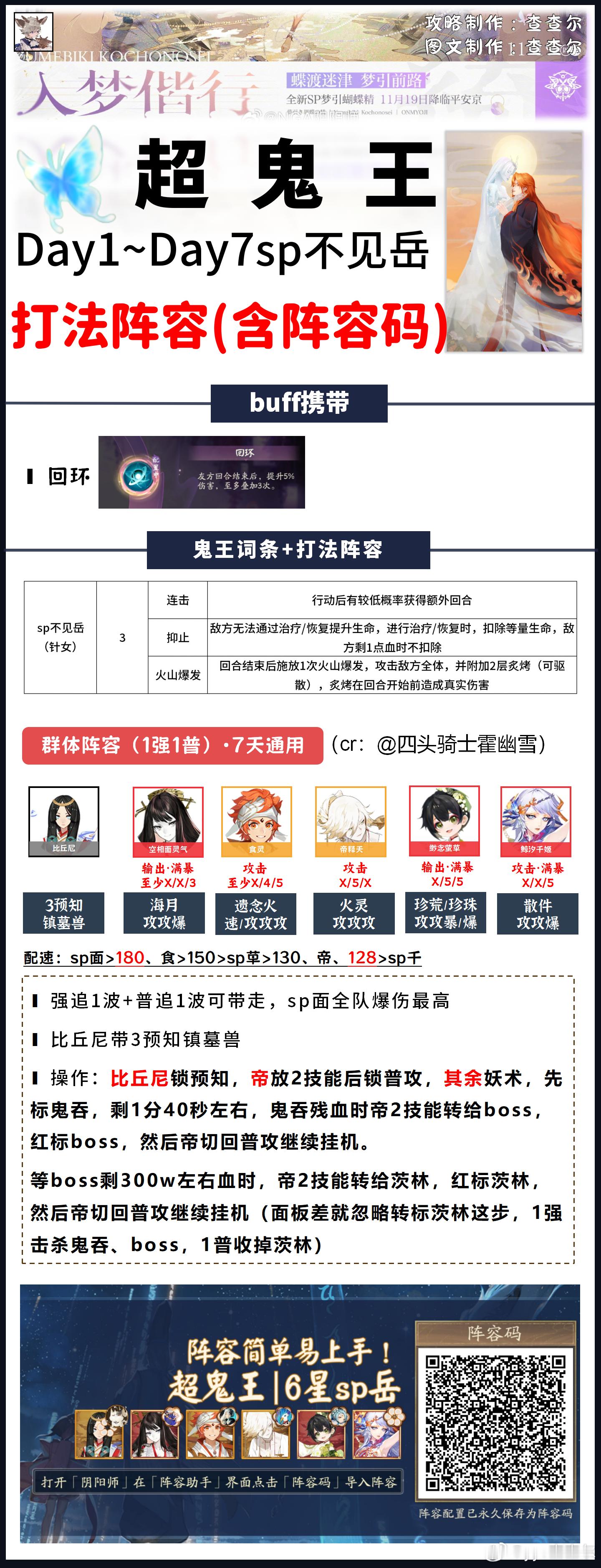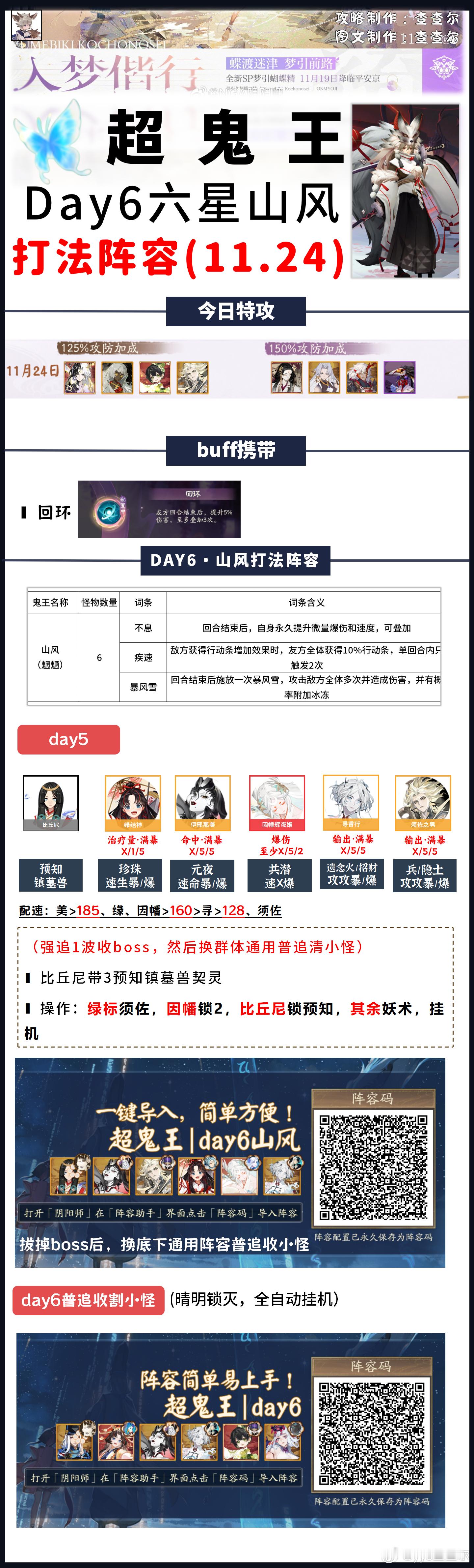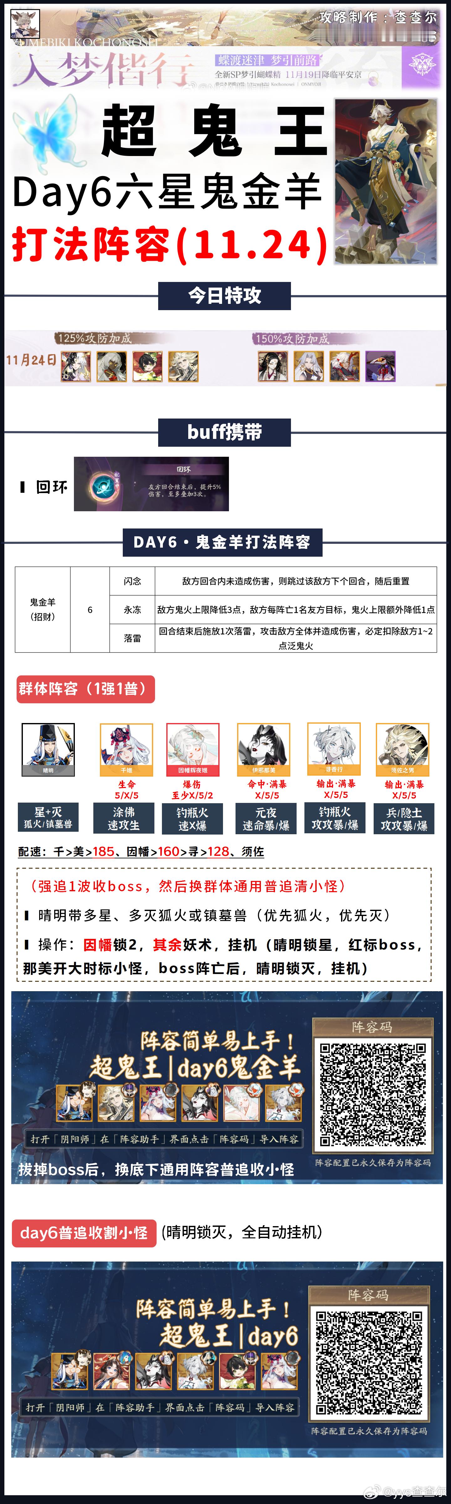 【超鬼王】dya6全鬼王阵容+阵容码一键配■今天主力特攻是须佐和sp草。须佐1强拔高星boss,然后换sp草1普收小怪(sp草可换ssr叉姬,不推荐sp叉姬,动画慢且多动容易卡火)■今日进一步优化了帝卷拔主怪阵容的配置,优化了打sp岳阵容中sp草的配置day6:1~4星+5、6星清小怪+山兔/睡猪通用普追:|TA|034460b59d7deb7822feb08db34663b55星+部分6星:①鬼童丸/sp鬼童丸/sp般若/泷/sp荒川/彼岸花|TA|0a3faa9ddddefe6360a6084d75c59376②sp九命猫/那美/月读|TA|2a4f77b4bbeec45fbb2e8f2b0ffc5c7asp烟烟罗/sp缘结神|TA|3480095f2bfeeedd895fe670179a22e2④sp灯/鬼金羊|TA|bb802426a842b6a3339738dc8cae48a2⑤封阳君/山风|TA|aca64e2c690a46cbc98110701f1618e8⑥御馔津|TA|fd8a57f31b5ff2819598cdefcb9b7191⑦铃彦姬|TA|f8b5a3bed5b5071ae720333489394110⑧荒骷髅|TA|873f0bf6b8c129f3214530a5ef1db0186星:sp不见岳|TA|08d4456b0083824b27cba3b3a75e61c4平将门|TA|5deedbb0b426992d3b863e0ad9d370d1