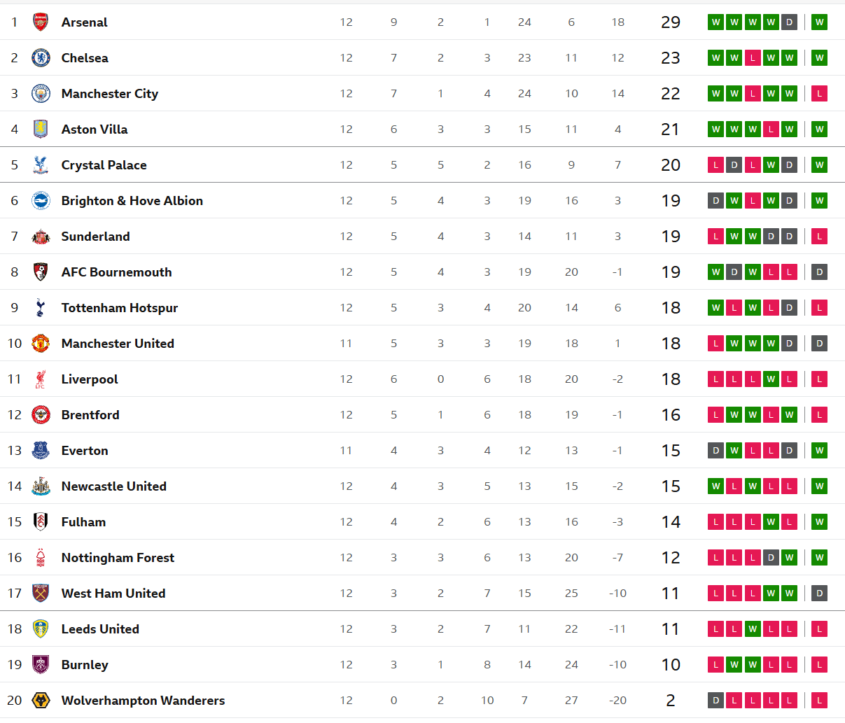 降级区方面,诺丁汉森林在本轮击败利物浦后逃离了降级区;西汉姆联在本轮拿到1分后也逃离了降级区,利兹联、伯恩利两支升班马双双跌入降级区。狼队则继续着失败之旅,他们前12轮只拿到2个积分。
