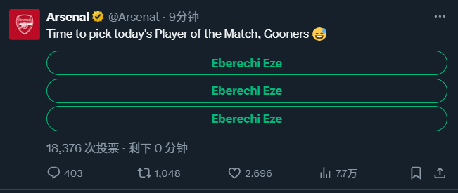 阿森纳官方在赛后发布队内最佳投票,三个选项都是埃泽。